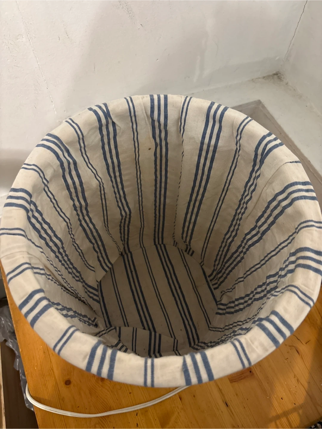 This wicker hamper is perfect for storing laundry. It has a striped fabric lining and a matching lid to keep things tidy. Measures approximately 18 inches tall.