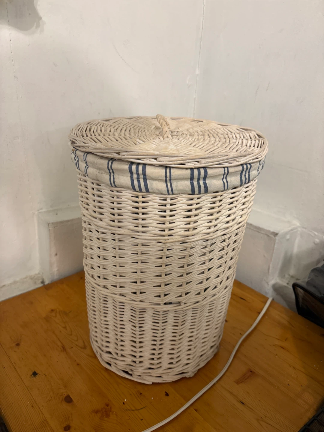 This wicker hamper is perfect for storing laundry. It has a striped fabric lining and a matching lid to keep things tidy. Measures approximately 18 inches tall.