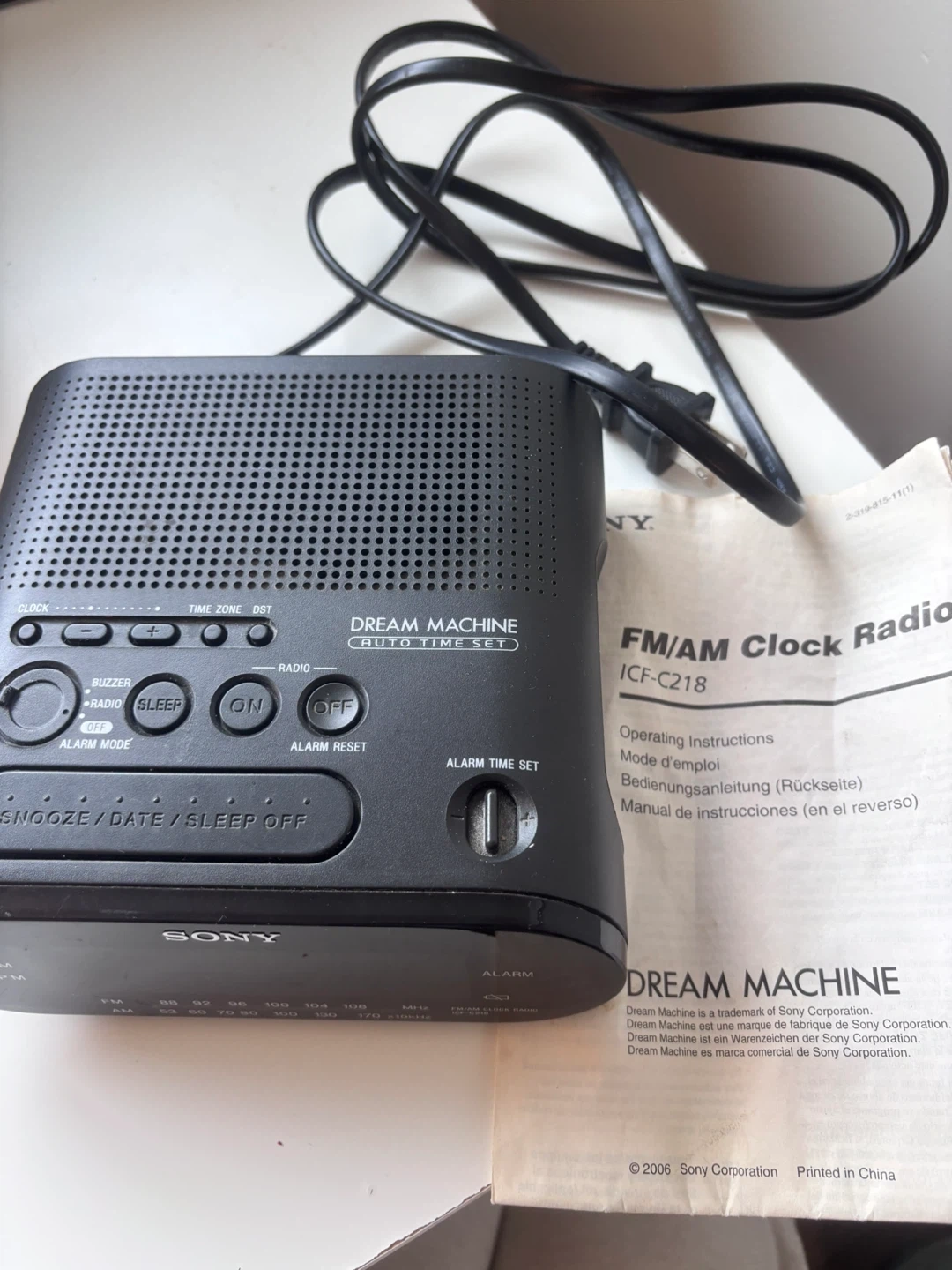 This Sony Dream Machine clock radio offers AM/FM tuning and an auto time set feature. It includes a snooze button and alarm functionality. Power back up is provided by a lithium battery.