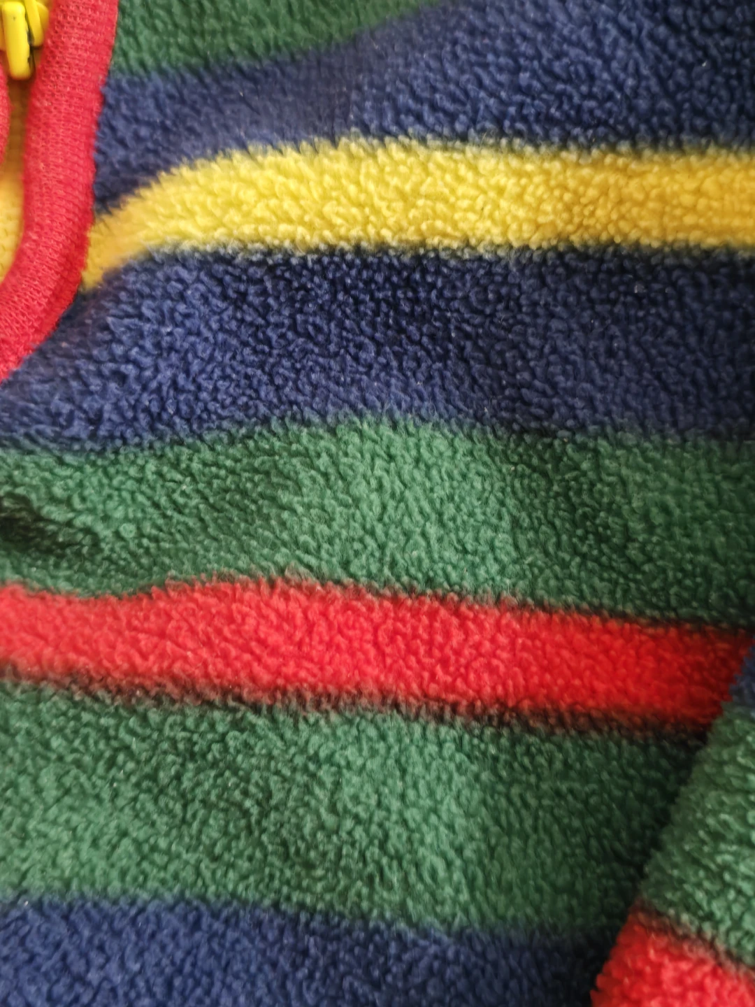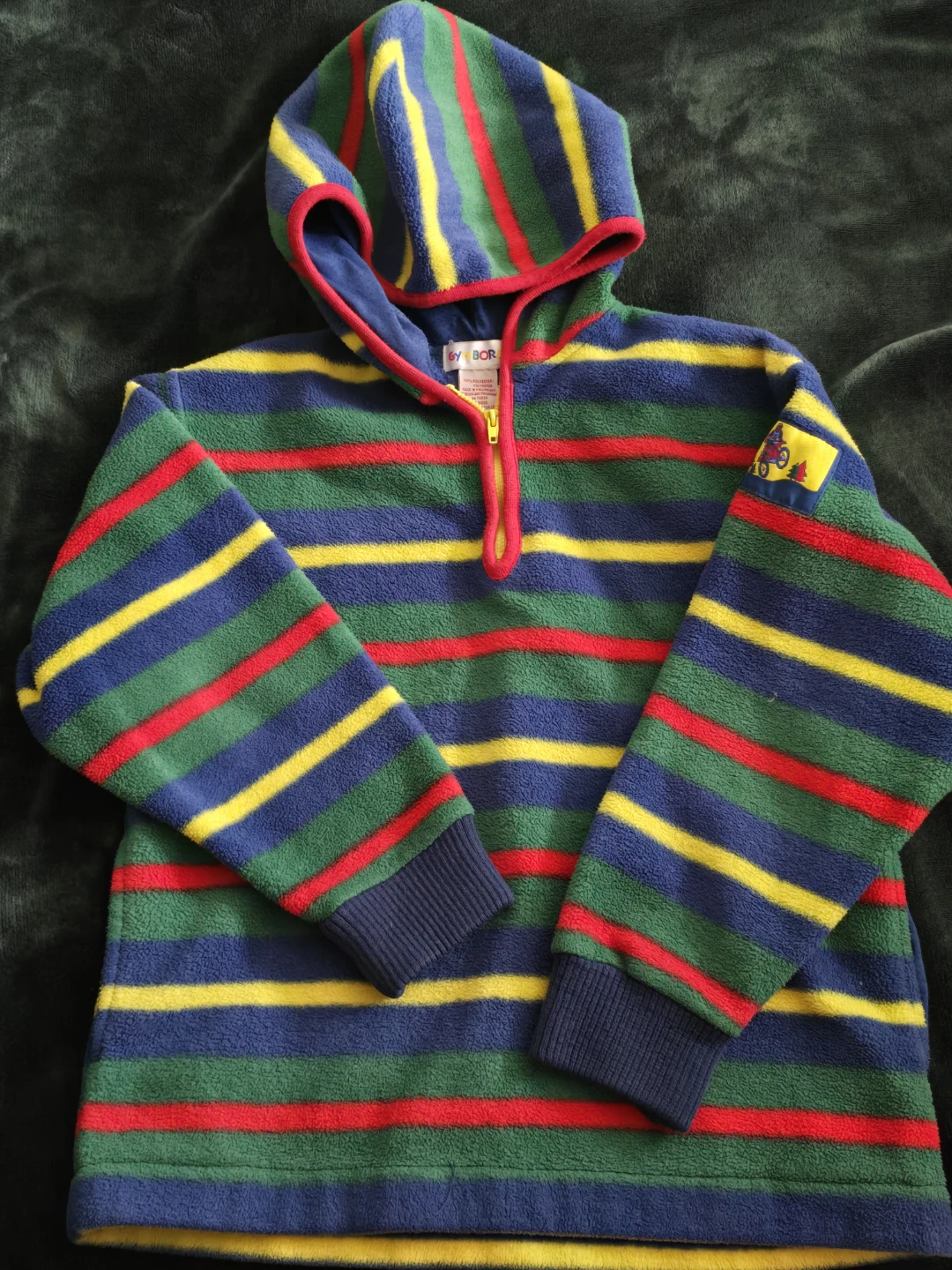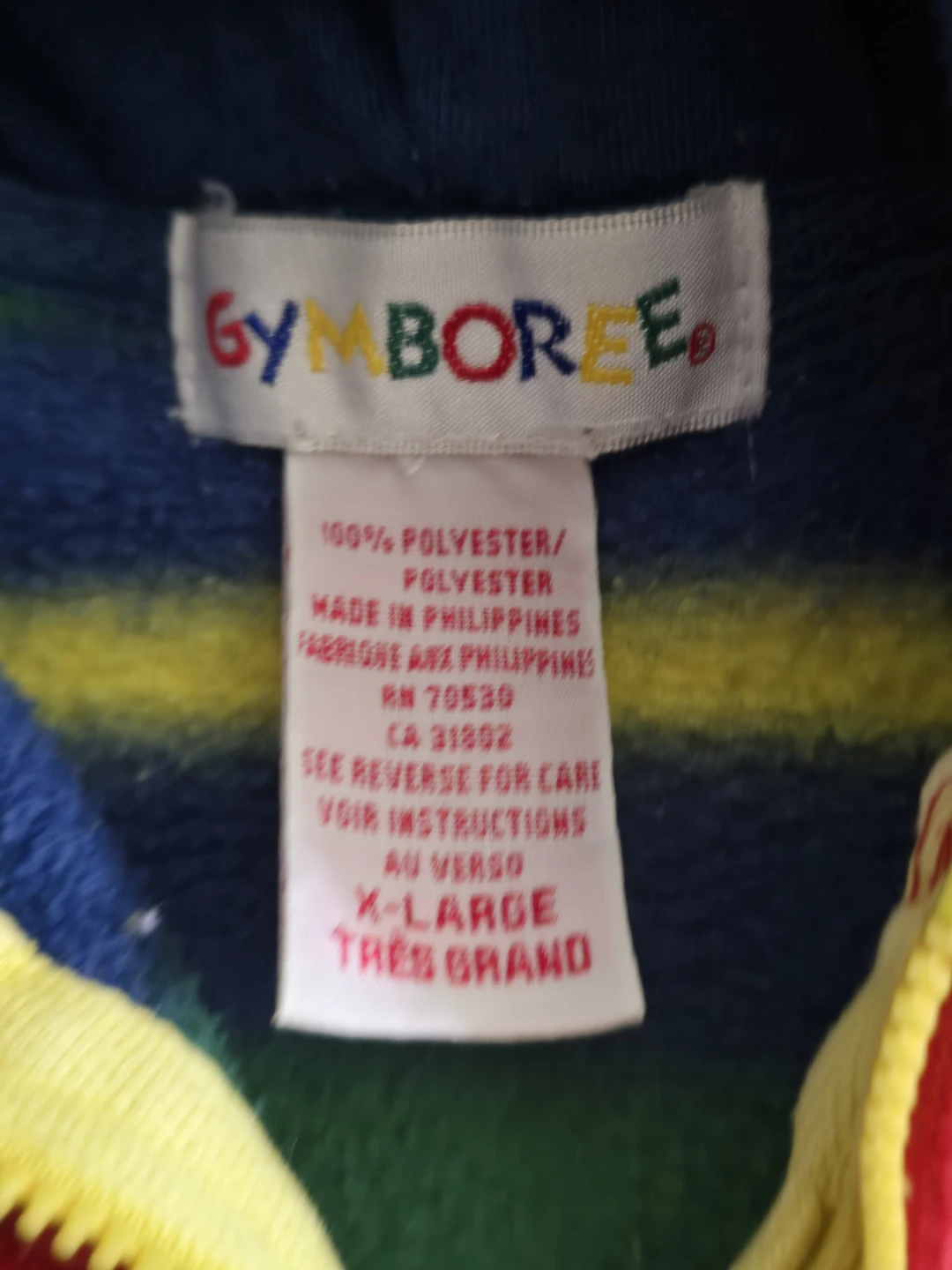 Cozy Gymboree fleece hoodie with a colourful striped pattern. Made from 100% polyester and manufactured in the Philippines. It's a size X-Large, perfect for keeping kids warm on chilly days!