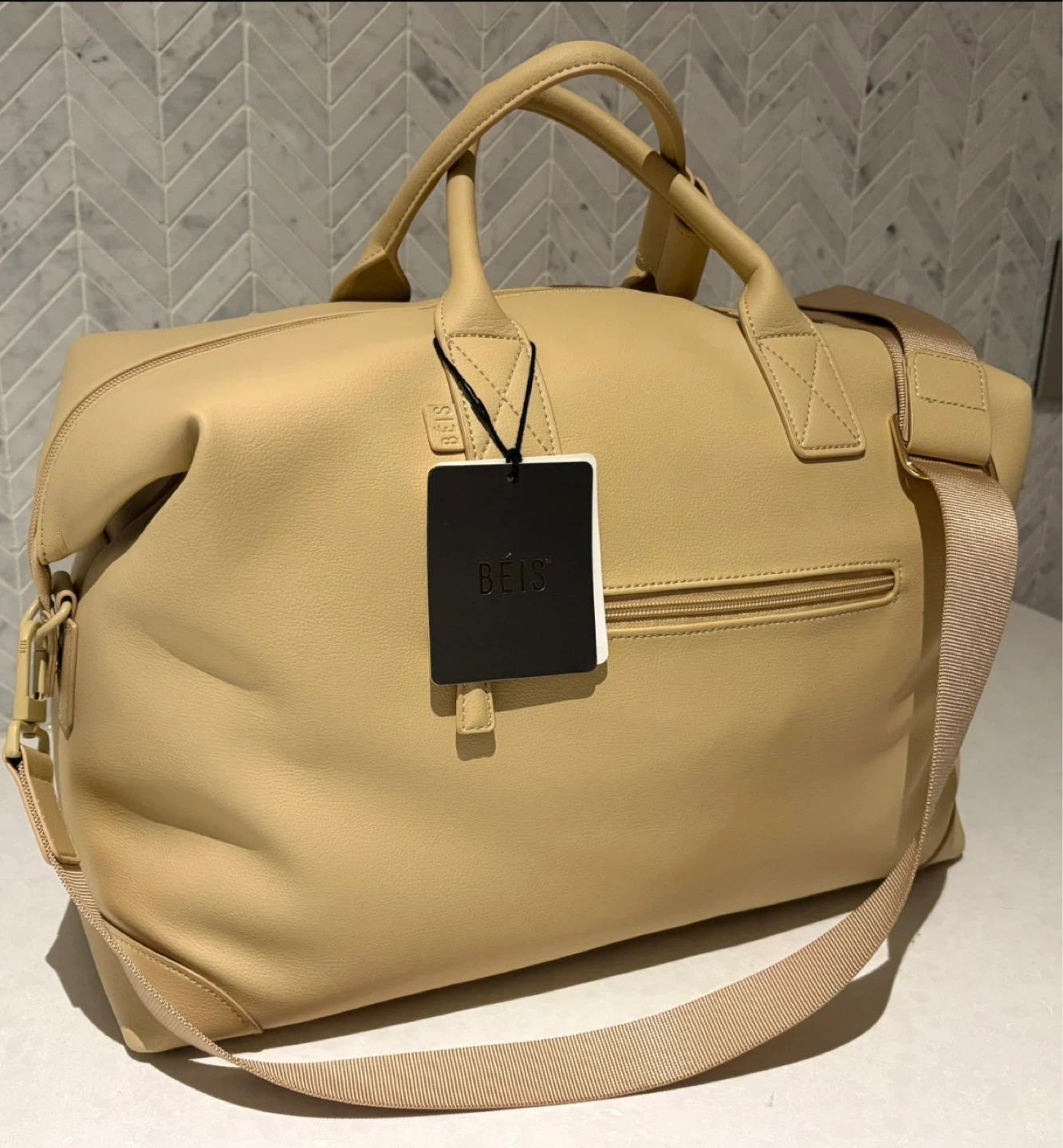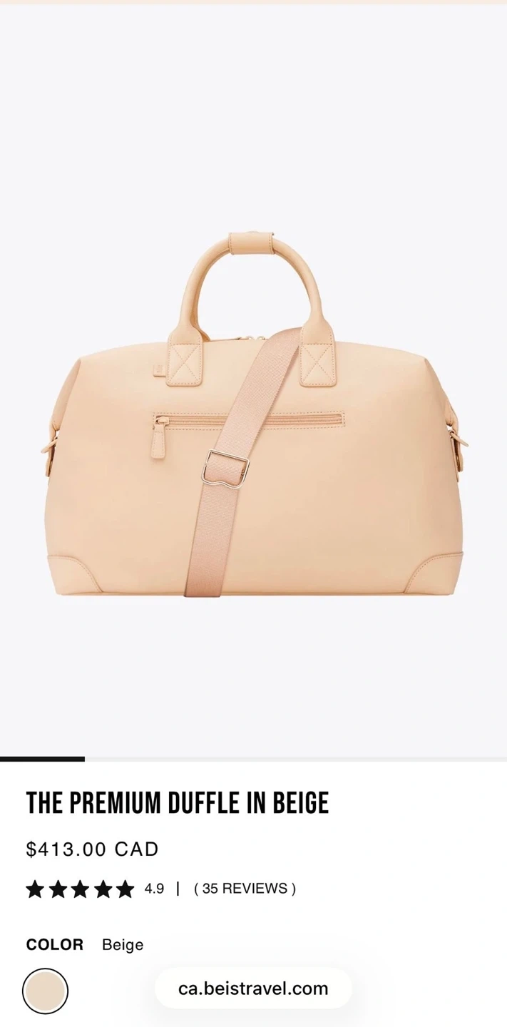 Béis The Premium Duffle in beige. This spacious bag is perfect for weekend getaways. It features a durable construction and a stylish design.