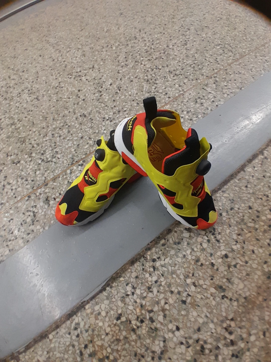 Reebok InstaPump Fury sneakers in yellow, black, and red. These iconic shoes feature a unique InstaPump technology for a custom fit. Great for everyday wear or athletic activities! Men's Size 9.5