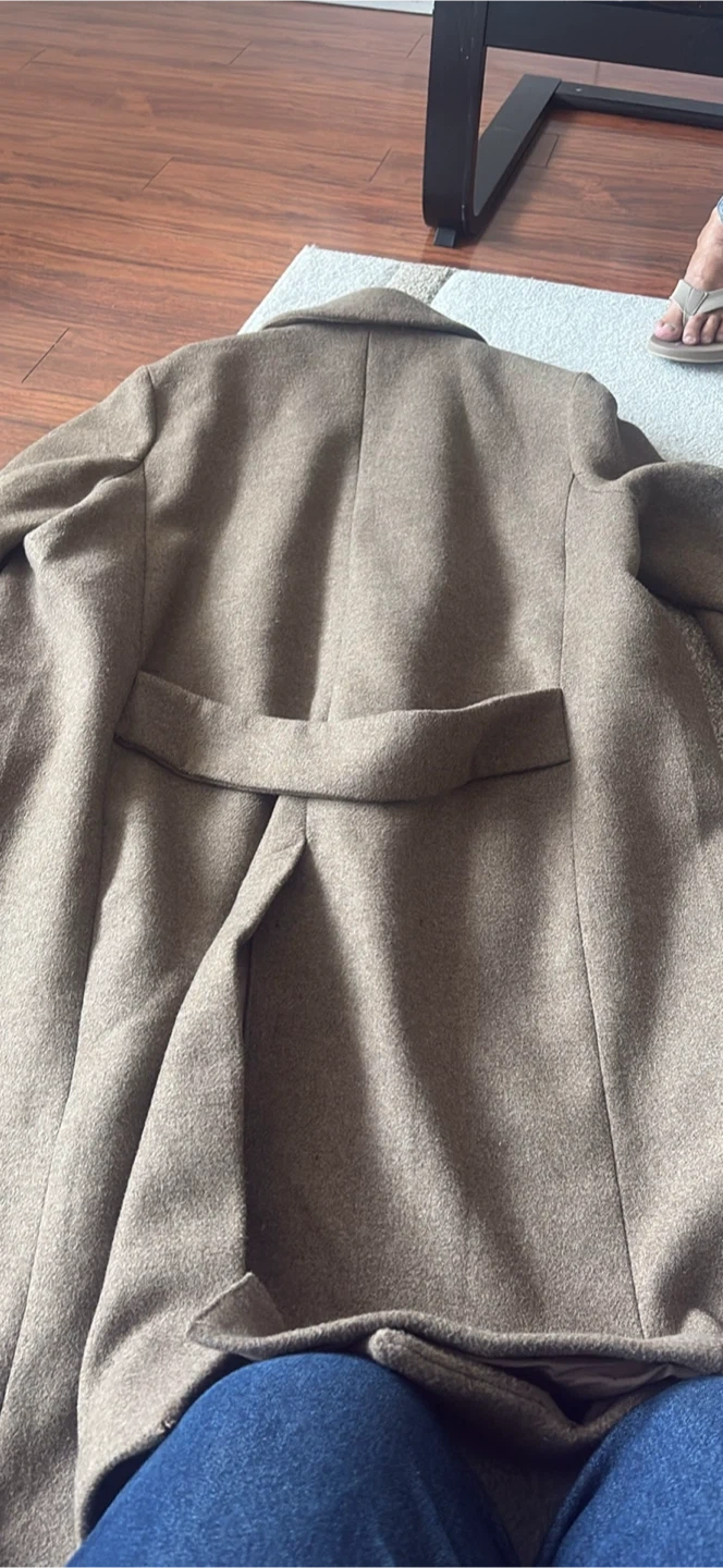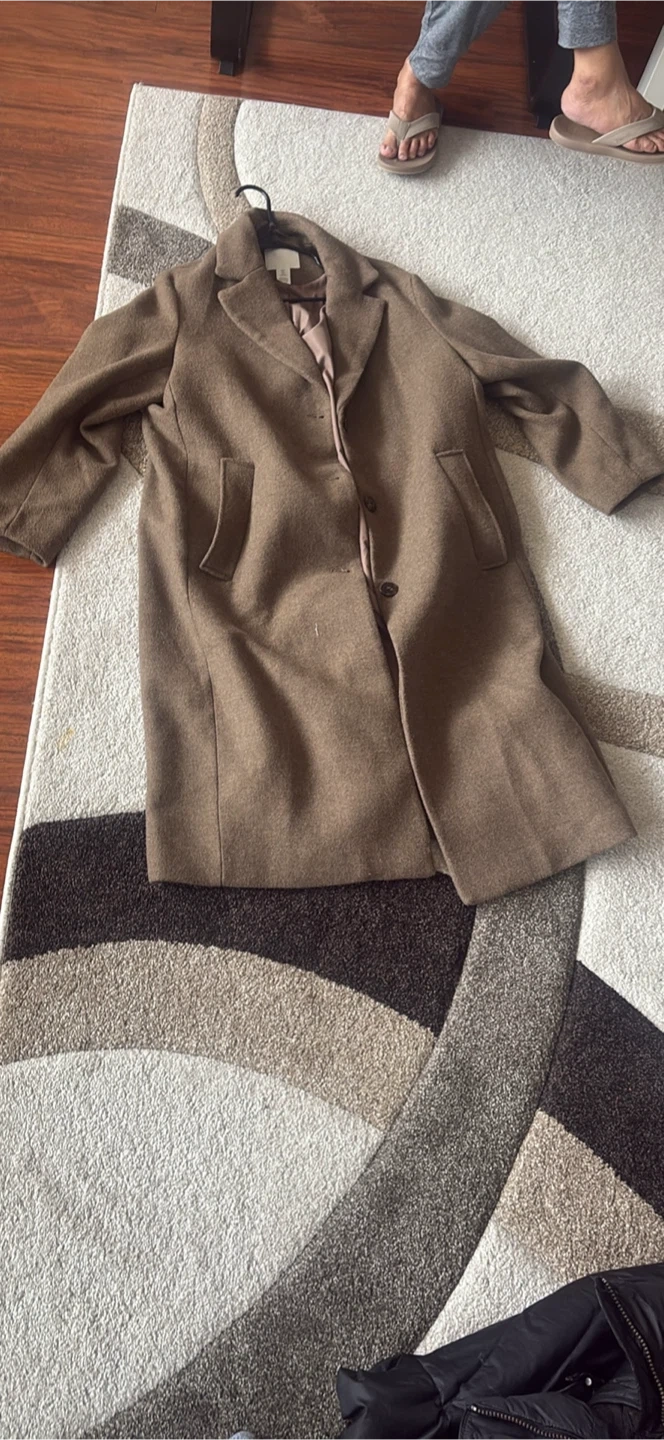 A brown H&M wool blend coat. It's a size medium, EUR M, CAM M, CN 170/96A. Made in Bangladesh. This coat's classic style makes it versatile for many occasions.