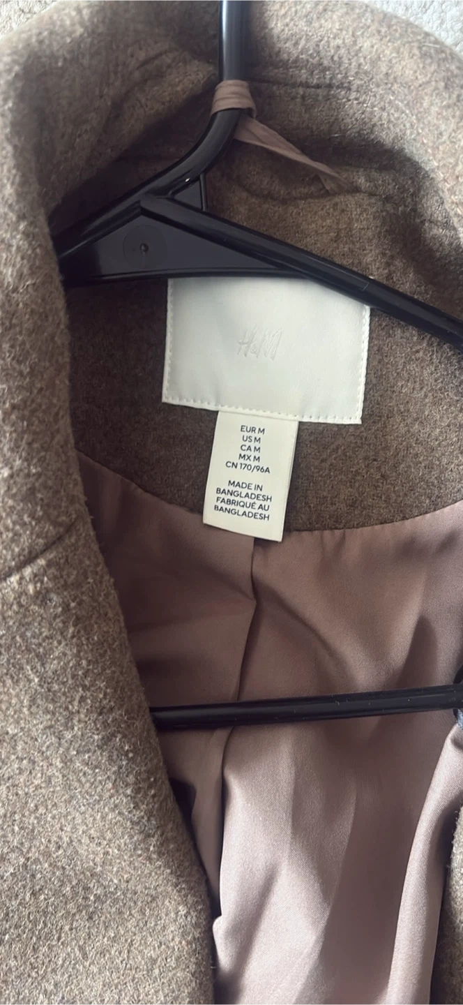 A brown H&M wool blend coat. It's a size medium, EUR M, CAM M, CN 170/96A. Made in Bangladesh. This coat's classic style makes it versatile for many occasions.
