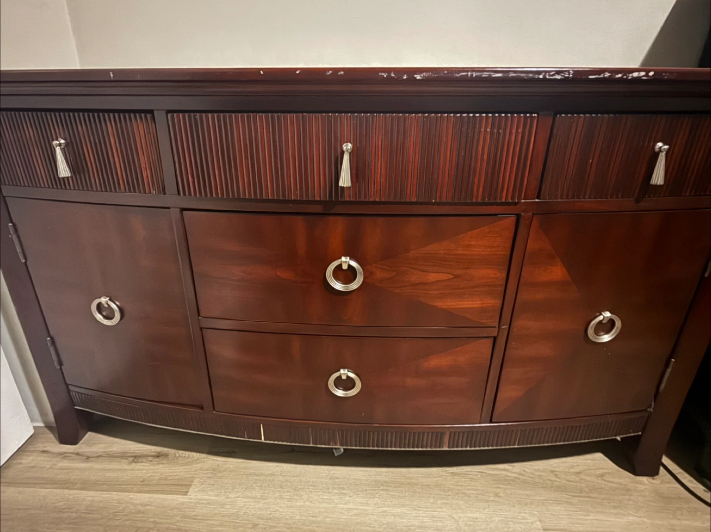 Selling a wooden console/dresser. It has a few drawers and cabinets for storage. There are some signs of wear and tear on the top surface.