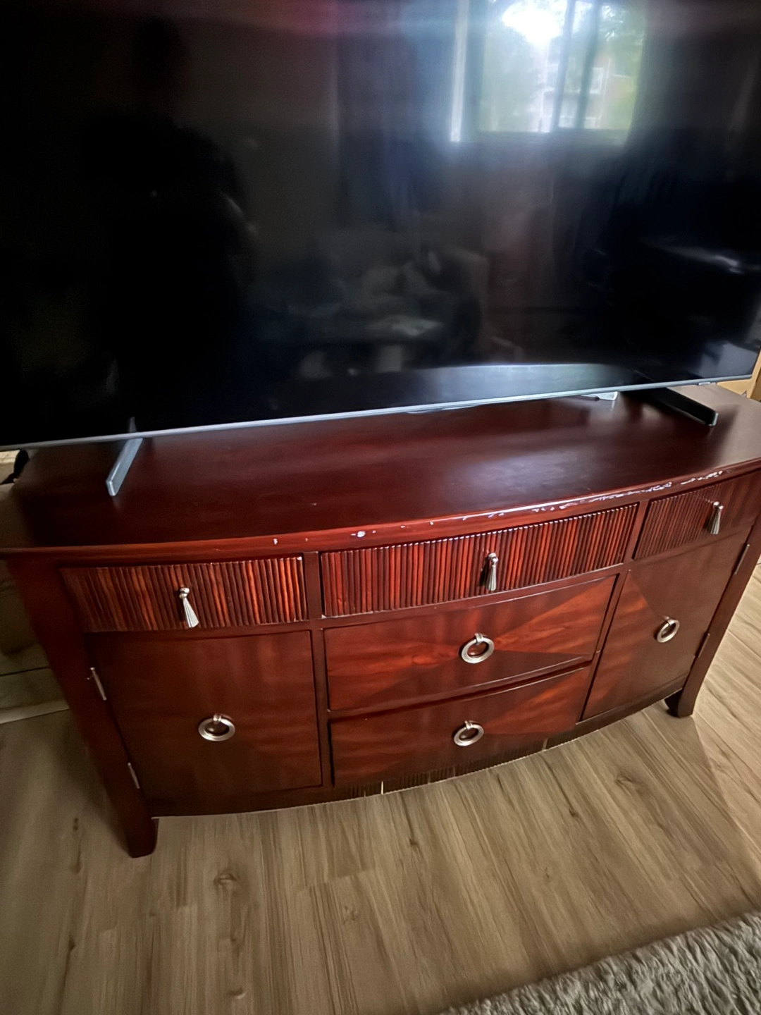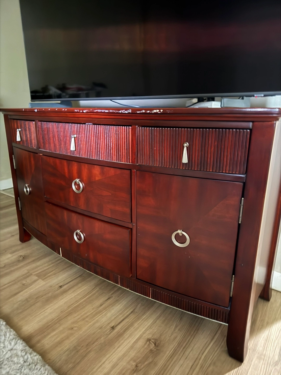 Selling a wooden console/dresser. It has a few drawers and cabinets for storage. There are some signs of wear and tear on the top surface.