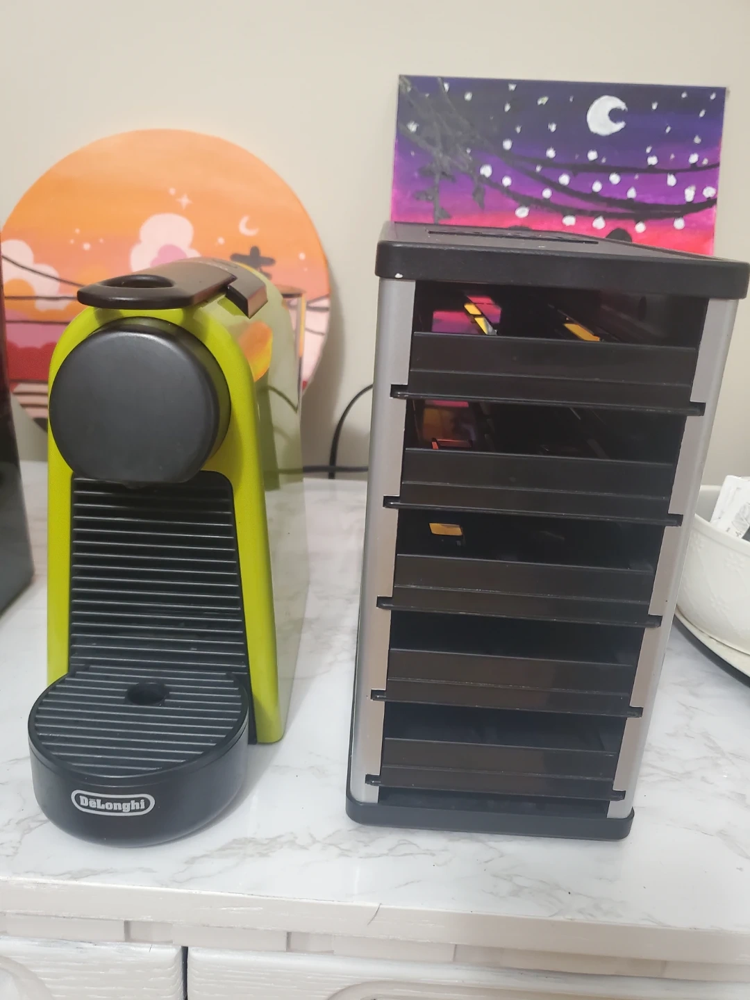Selling a DeLonghi Nespresso Essenza Mini in a fun lime green colour! It's a compact and easy-to-use machine for your daily coffee fix. Also included is a Cafe Stack pod holder to keep your pods organized