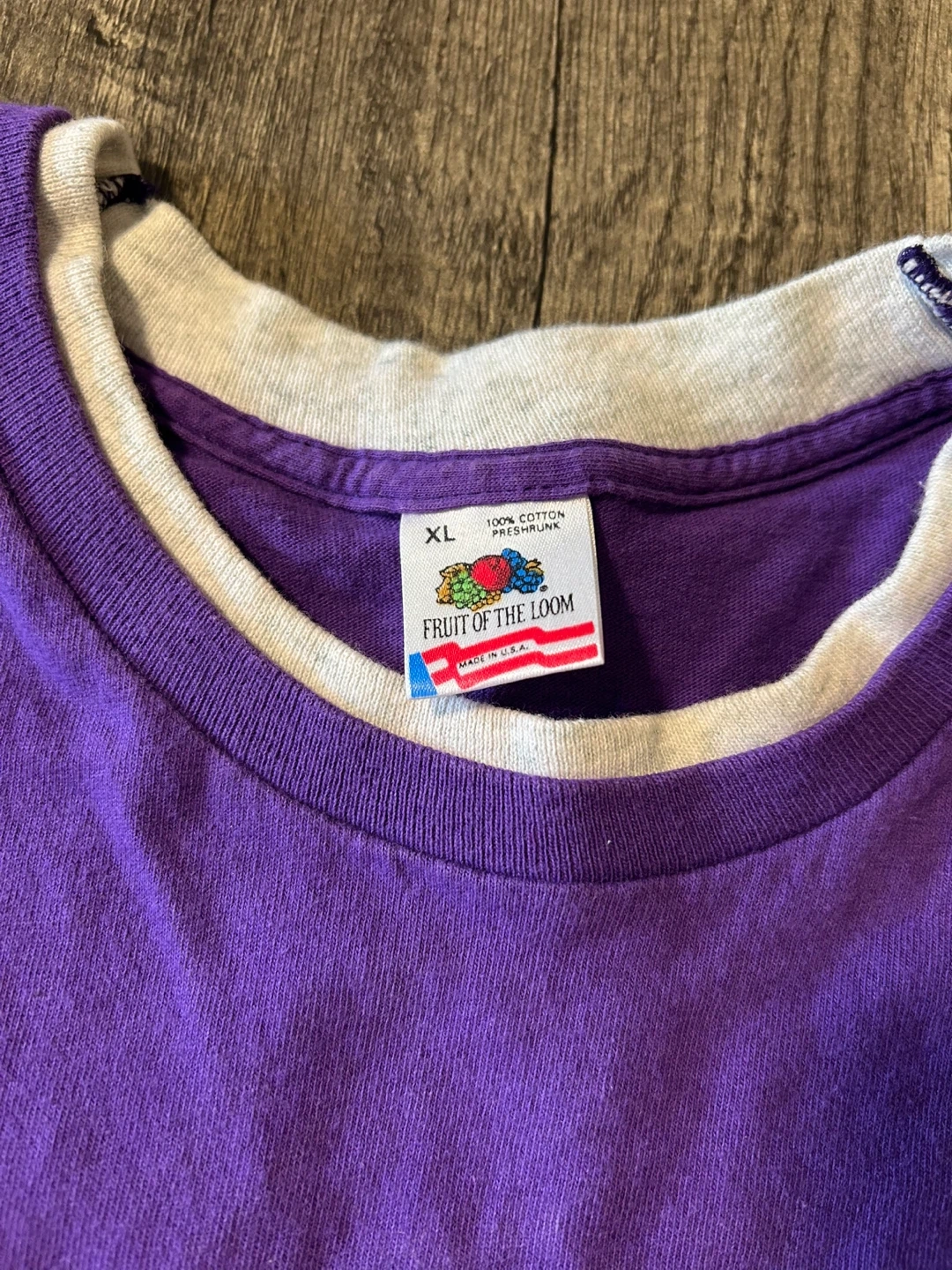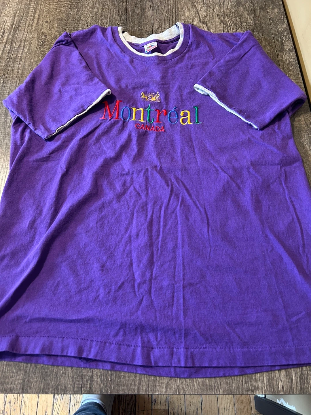 This is a vintage purple Fruit of the Loom t-shirt with "Montreal Canada" embroidered on the front. It's a size XL with a grey contrasting neckline and sleeve trim. 100% cotton preshrunk material.