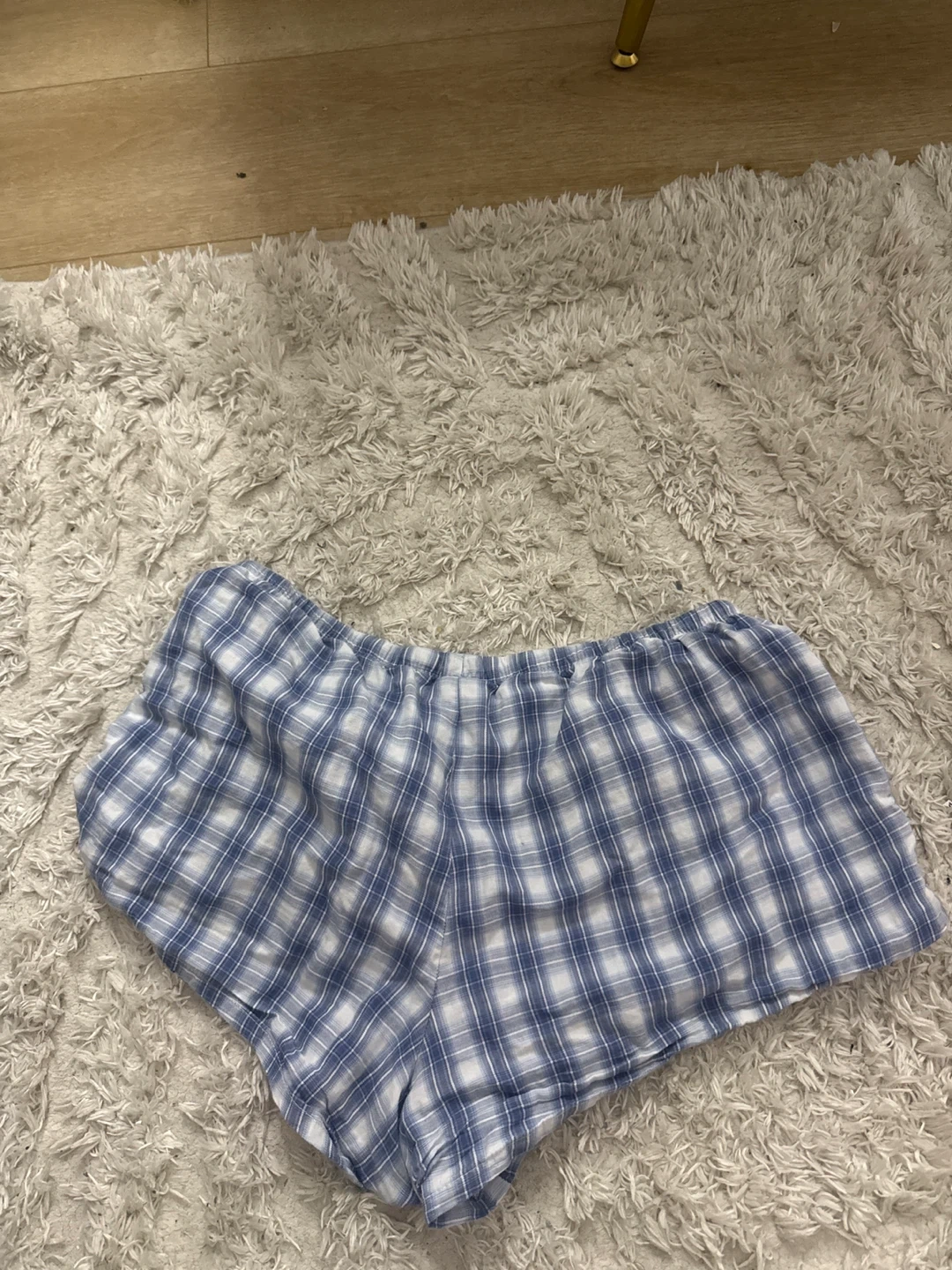 Selling a pair of Hollister sleep shorts in a blue and white plaid pattern. They're super comfy for lounging around the house! The size is S and they're made of 100% cotton