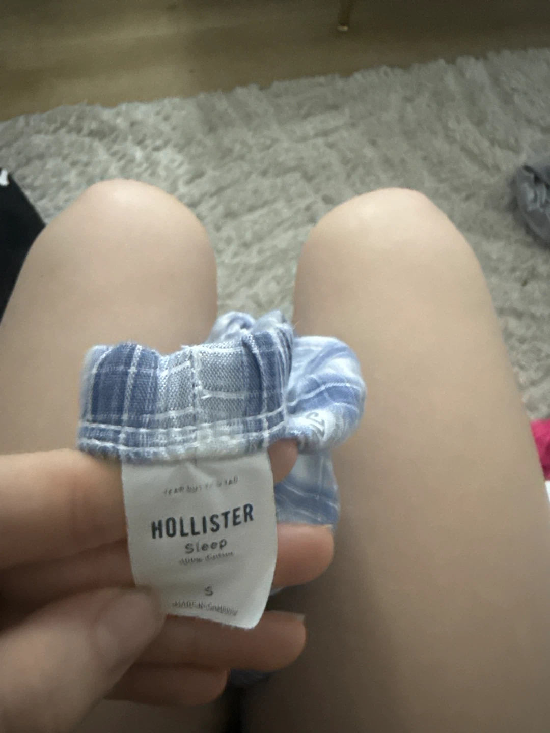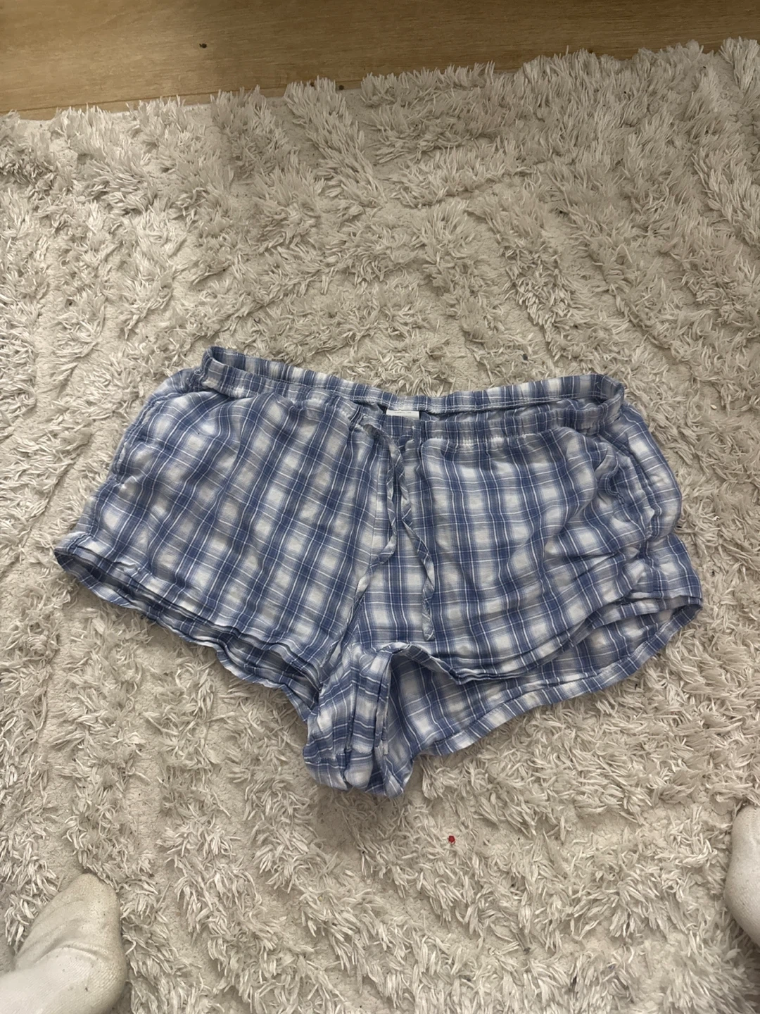 Selling a pair of Hollister sleep shorts in a blue and white plaid pattern. They're super comfy for lounging around the house! The size is S and they're made of 100% cotton