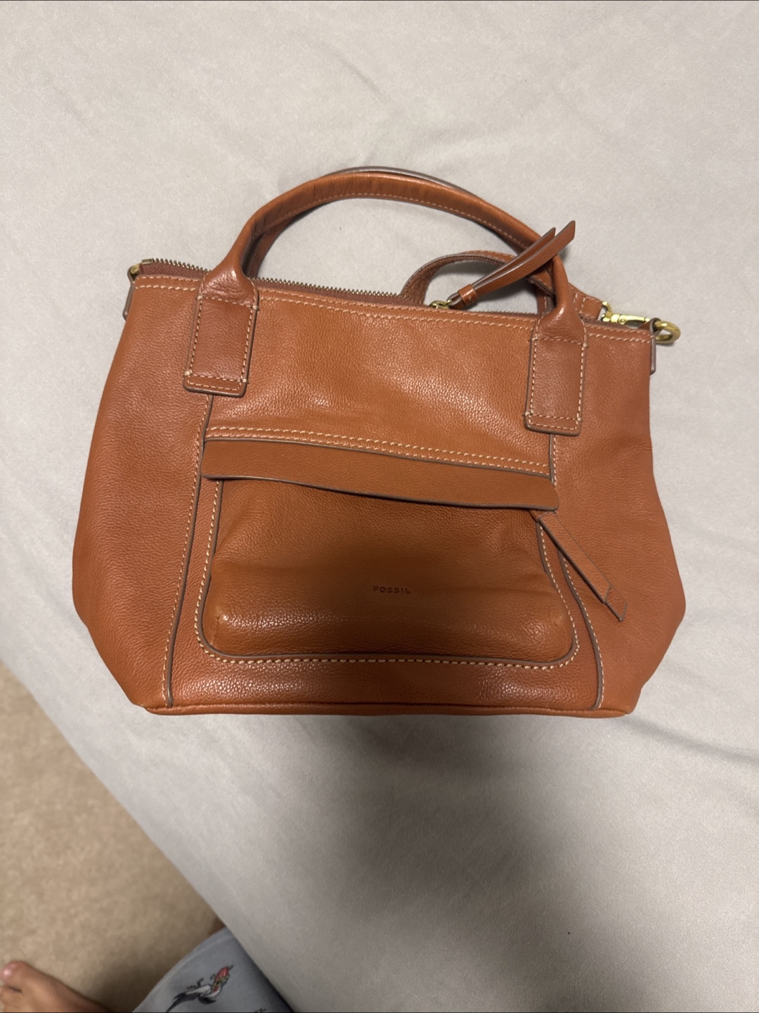 Here's a lovely Fossil satchel in brown leather! It's in great condition and ready for a new home. The bag features a convenient front pocket and classic styling, perfect for everyday use