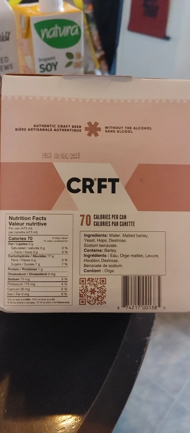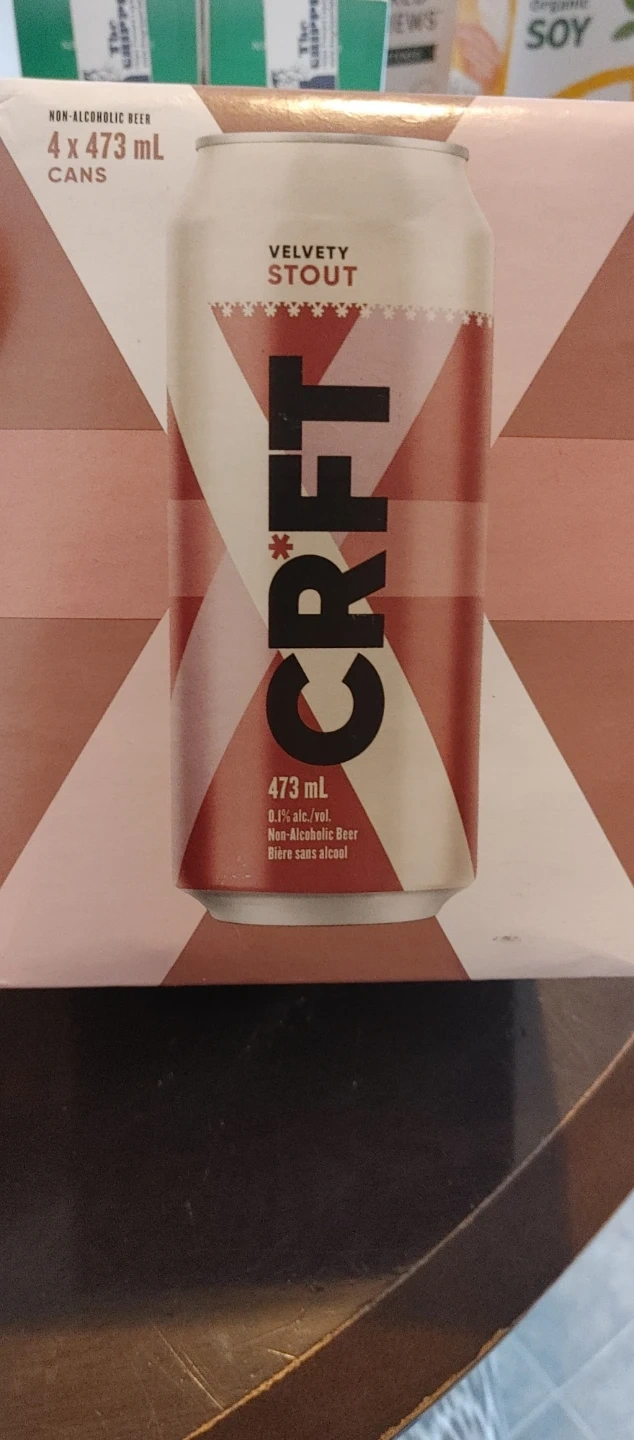 This is a 4-pack of CRFT Velvety Stout non-alcoholic beer. Each can is 473 mL. It's made with water, malted barley, yeast, hops, and dextrose. Contains barley.