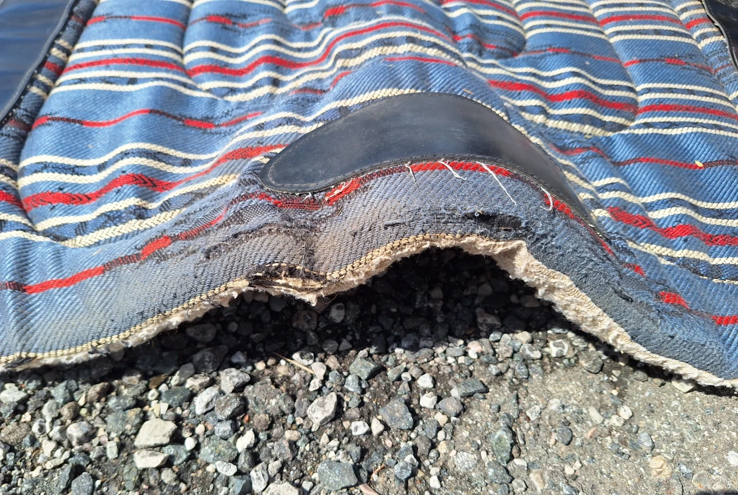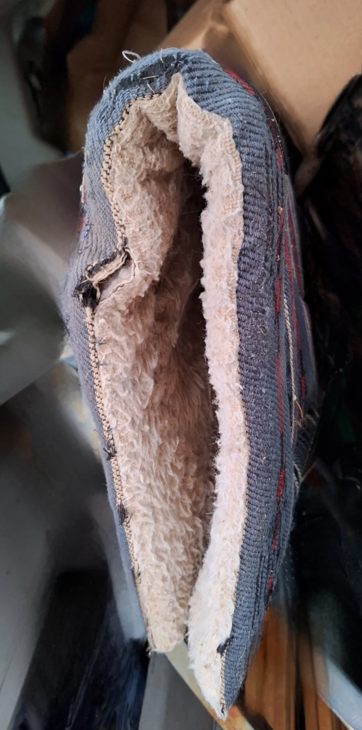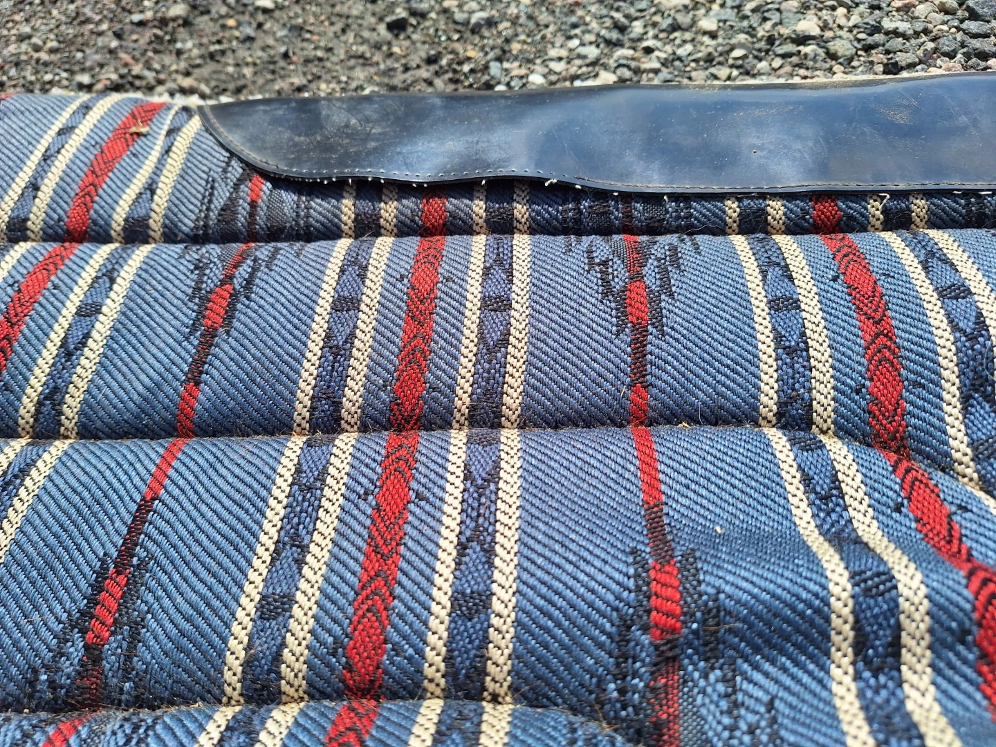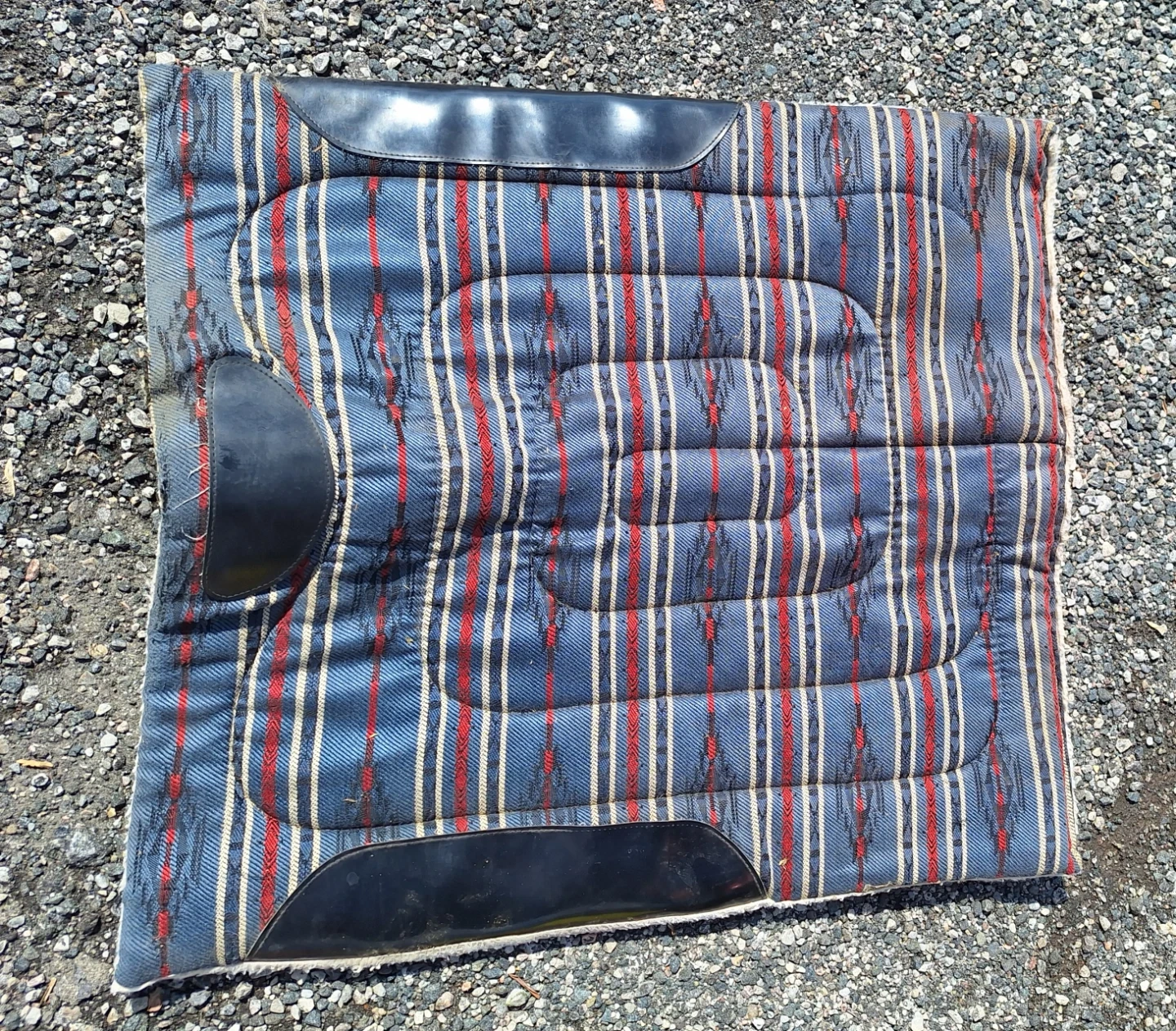 Quilted western saddle pad with a striped blue, red, and cream pattern. It features black leather trim at withers and sides and a fleece underside. Shows signs of wear and tear, around the edges and stitching coming undone on one leather patch.