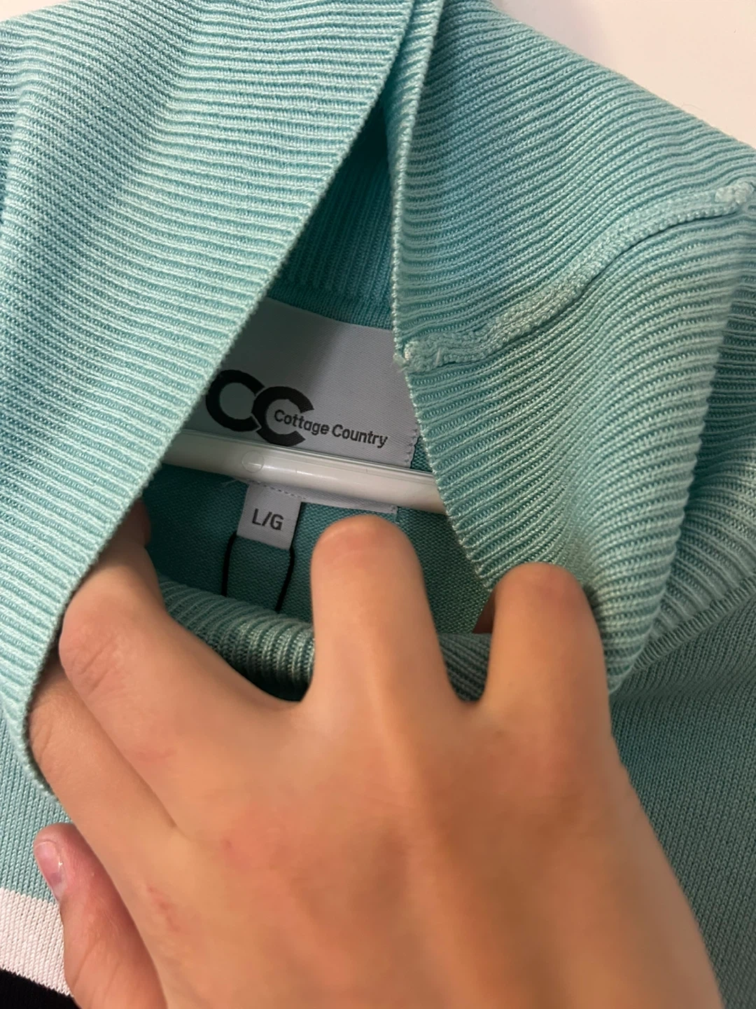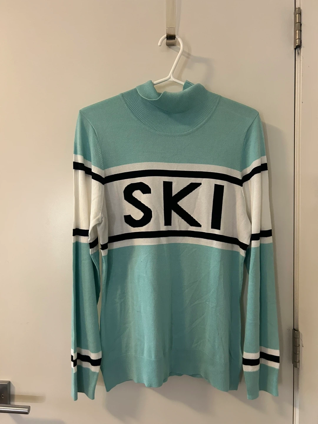 Selling a Cottage Country ski sweater in size L/G. It's a light blue/green colour with white and black stripes. Perfect for a casual day out or hitting the slopes!