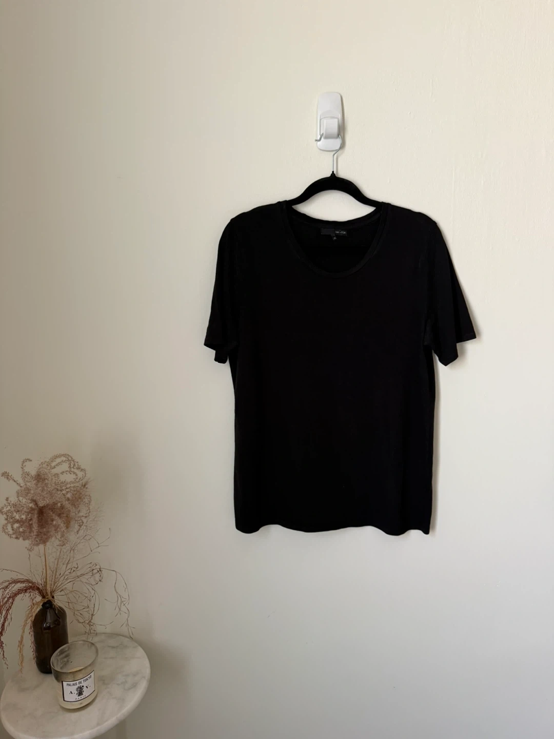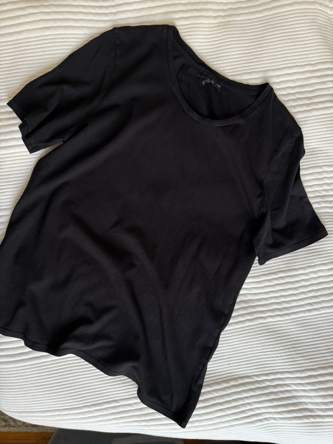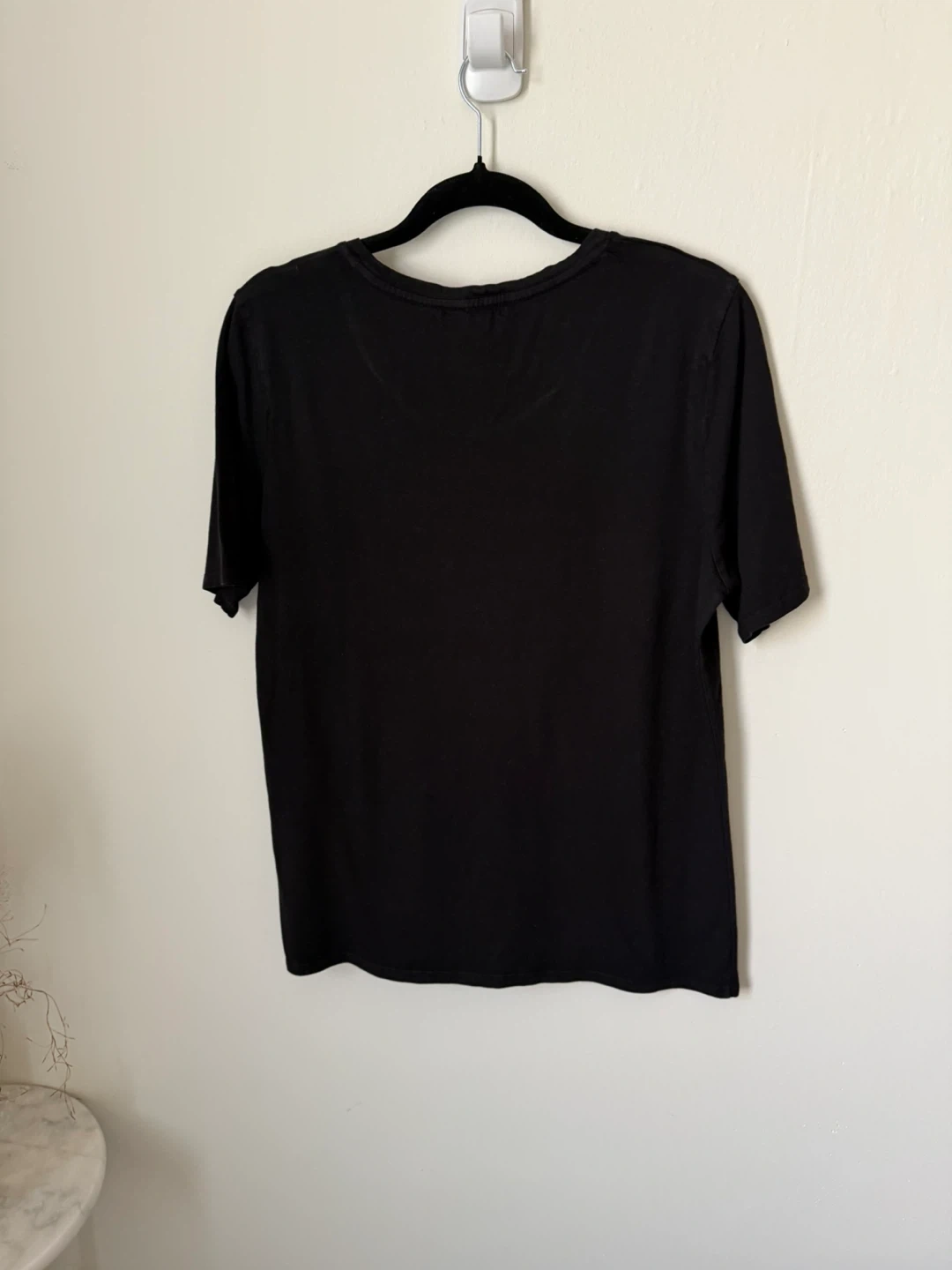 Flattering men’s classic-fit black tee shirt with short sleeves and a slightly-wider-than-scoop-neck neckline. Size Medium