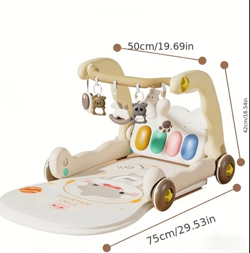 Versatile baby activity center with 3 ways to play. Little ones can kick and play on the mat (0-6 months), sit and play with the piano (6-10 months), or use it as a push walker (1 year+). Comes with cute hanging toys and light-up piano keys. Item approx 75cm long, 50cm wide, 42cm tall.