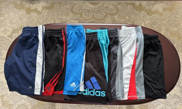 GAP XL(12). Adidas black with red stripe M(10-12). Adidas bright blue M(10-12). Adidas black with turquoise XL(18-20). Puma black and light gray both L(14-16). Black athletic shorts XL. $10 each OR $50 for the lot.