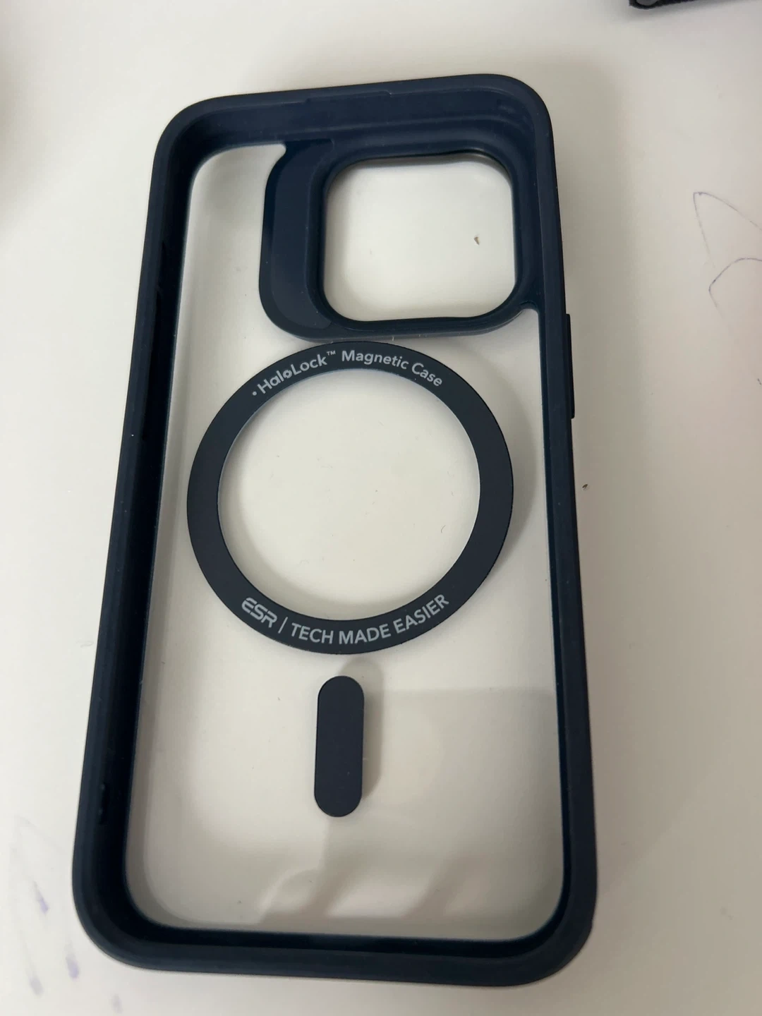 This is an ESR HaloLock Magnetic Case, designed for phones. It features a magnetic ring for MagSafe compatibility and a camera guard for protection. The case is clear with dark blue trim and for iPhone 14 Pro.