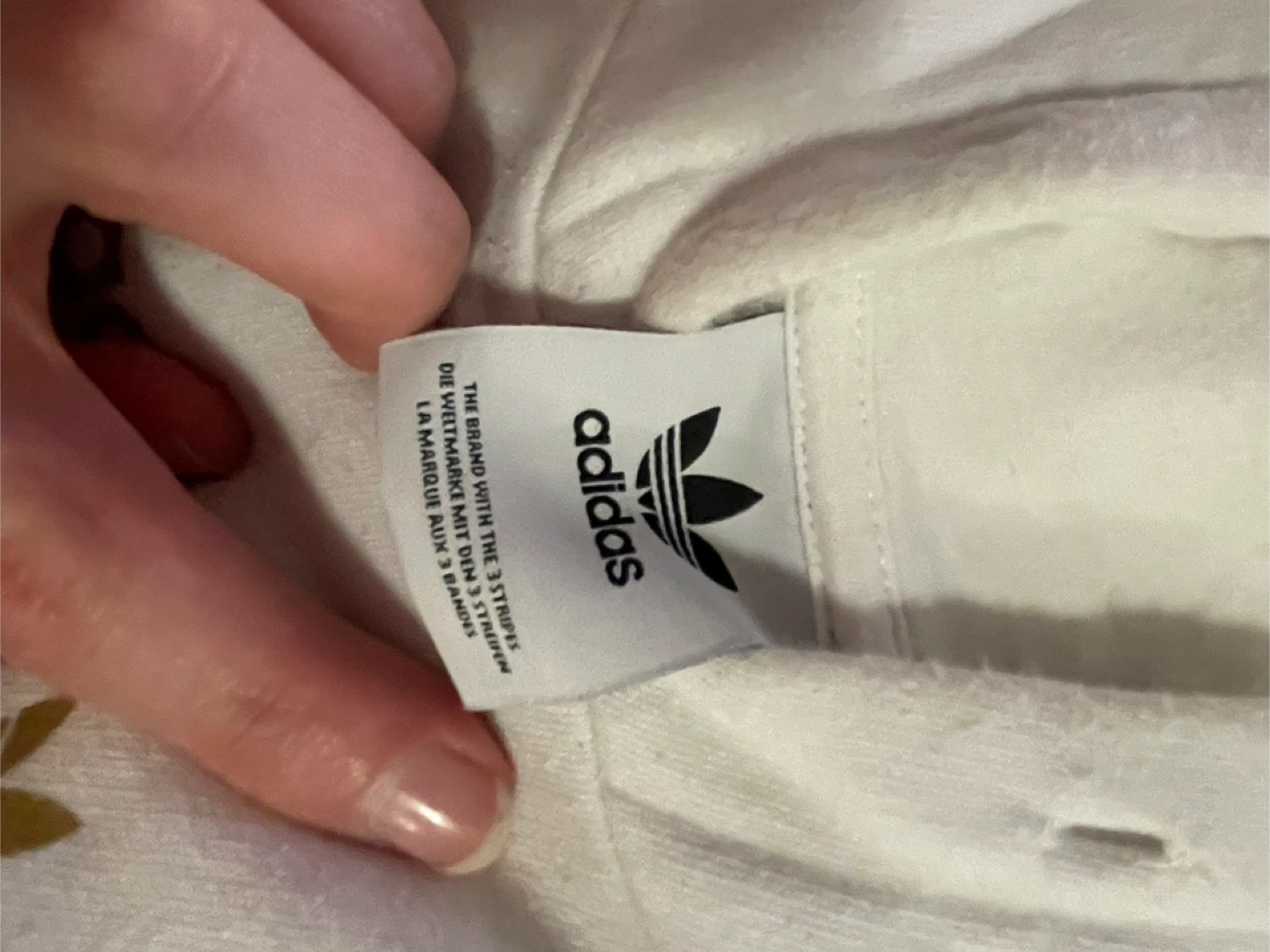 This is a white Adidas hoodie with gold detailing. It features the iconic Adidas logo and three stripes design on the sleeves. Made from comfortable material, it's suitable for casual wear.
