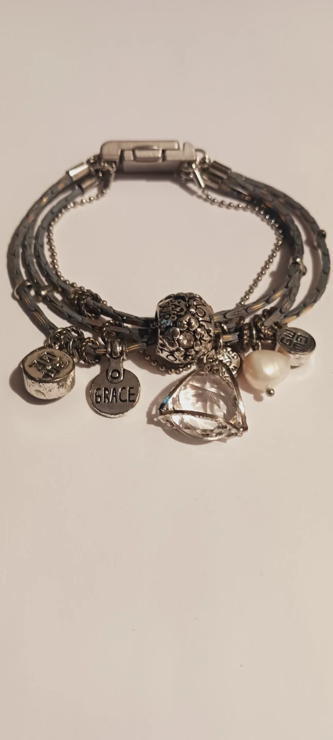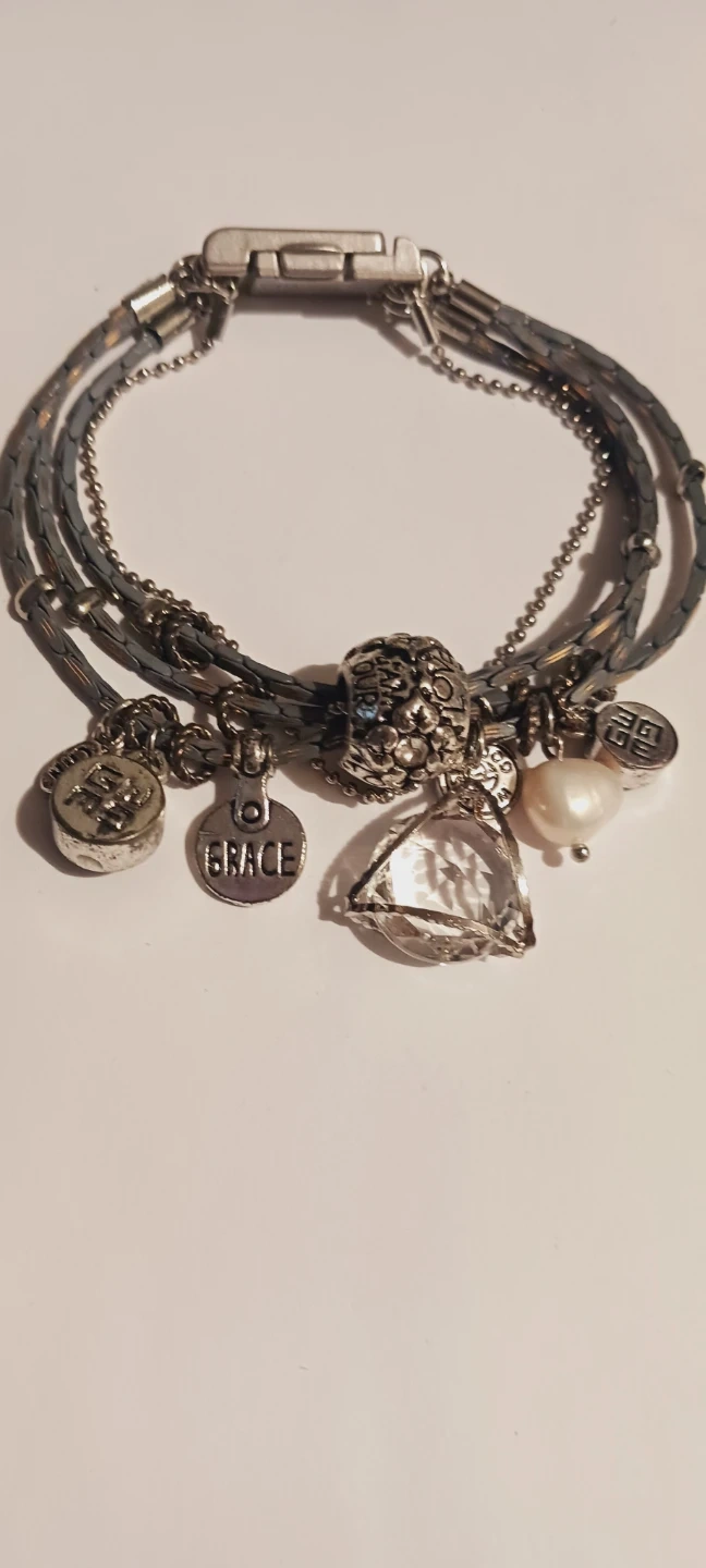This bracelet features multiple strands with various charms. It includes a 'Grace' charm, a Freshwater pearl, a crystal prism charm and other decorative charms. The clasp is a magnetic closure. It's a stylish accessory for everyday wear or special occasions!