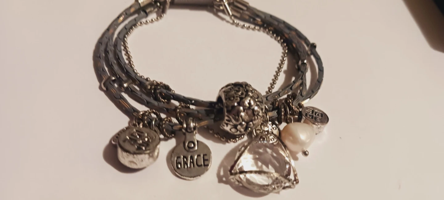 This bracelet features multiple strands with various charms. It includes a 'Grace' charm, a Freshwater pearl, a crystal prism charm and other decorative charms. The clasp is a magnetic closure. It's a stylish accessory for everyday wear or special occasions!