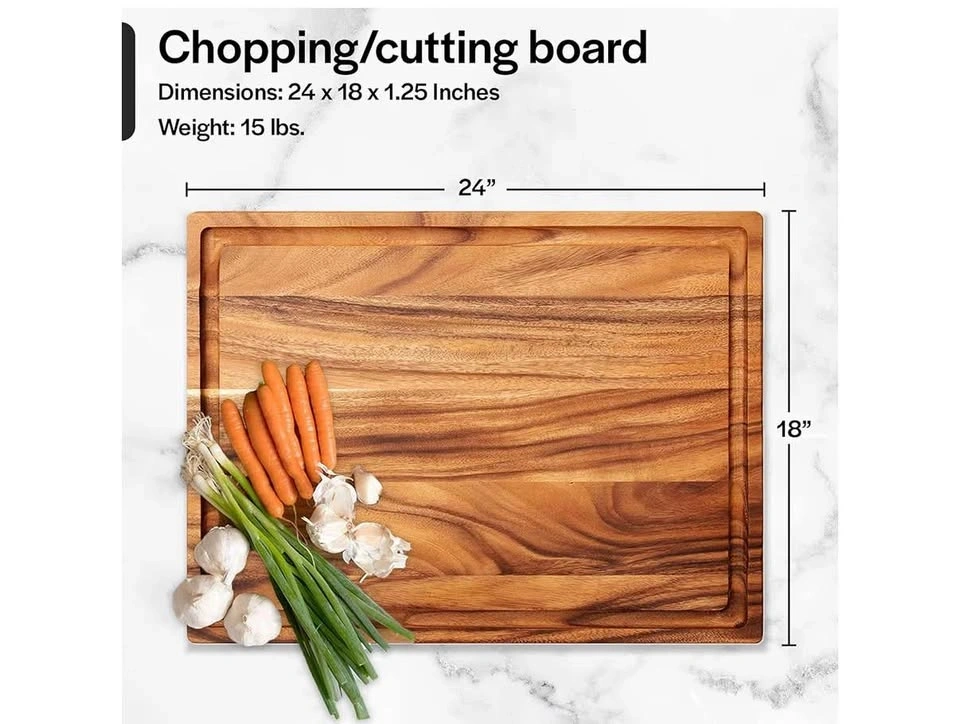 Made of premium Acacia wood. Dimensions: 24”x18”x1.5”. Used for about a year and has signs of use (see photos).