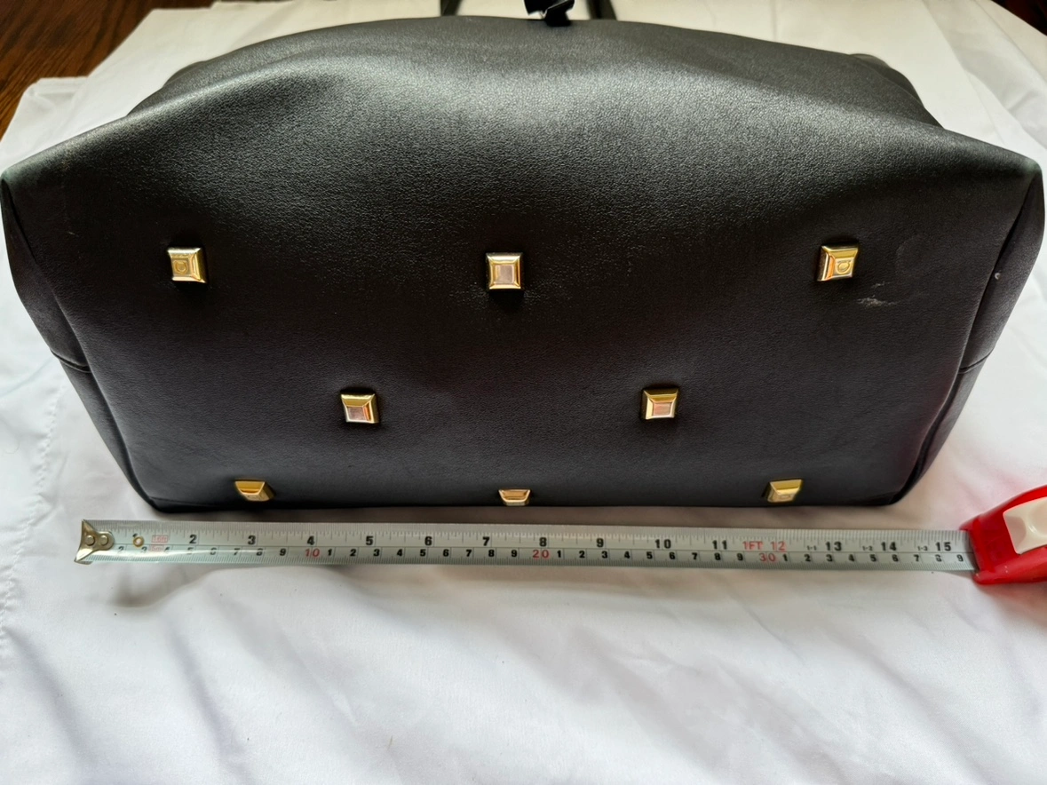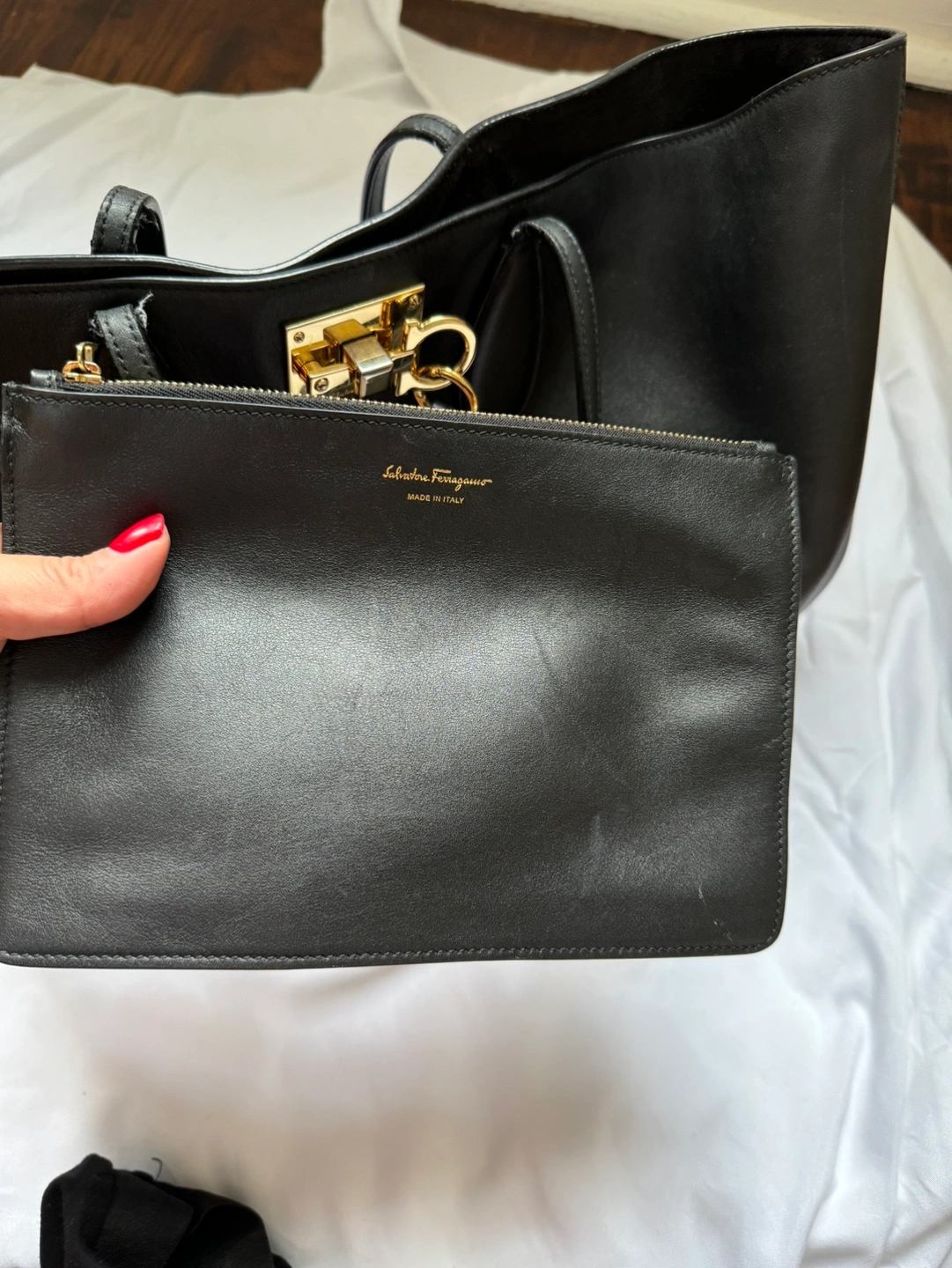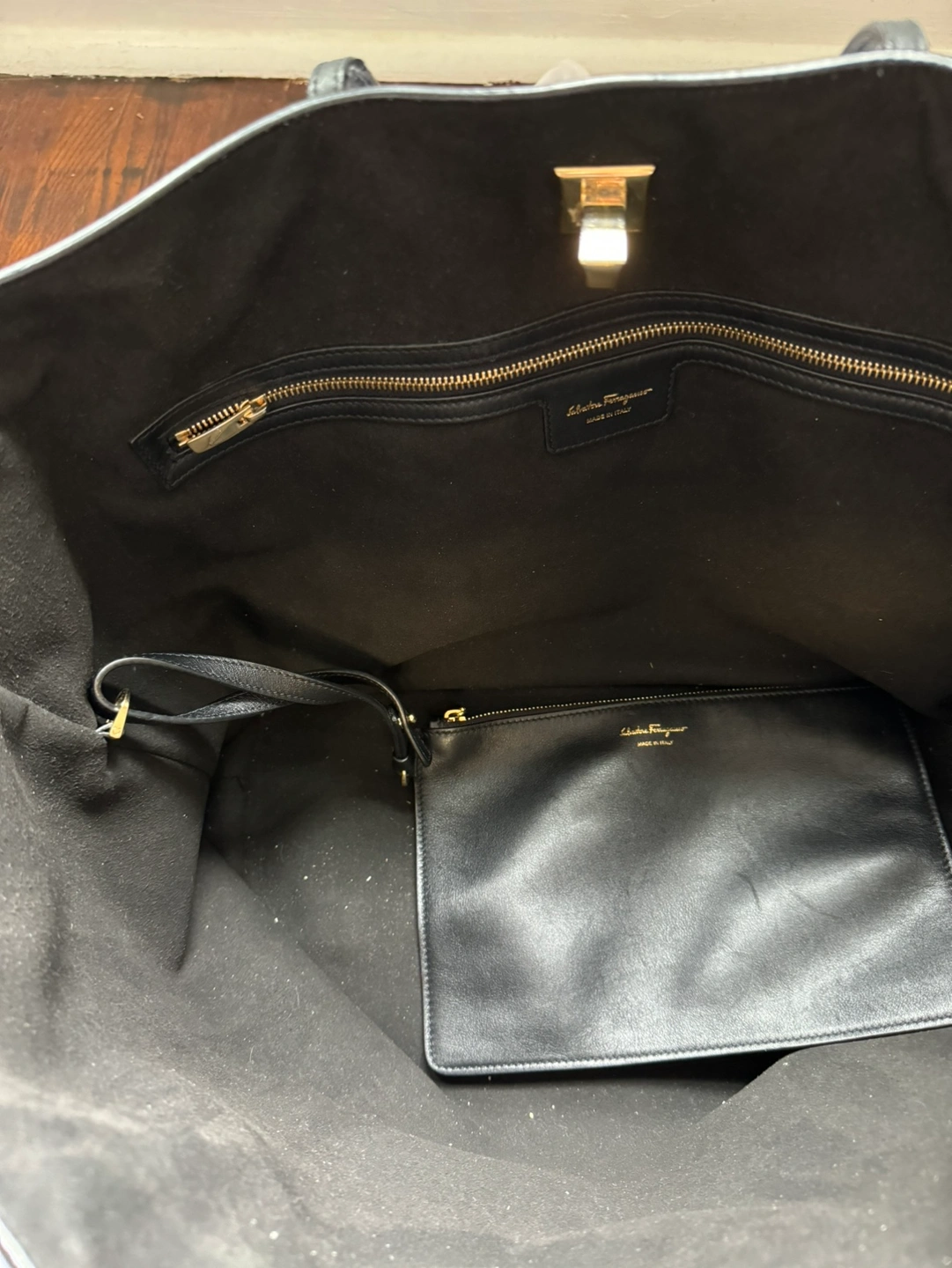 Large black leather tote bag with gold hardware and a tassel. The bag has a roomy interior and is perfect for everyday use. And a small bag inside.