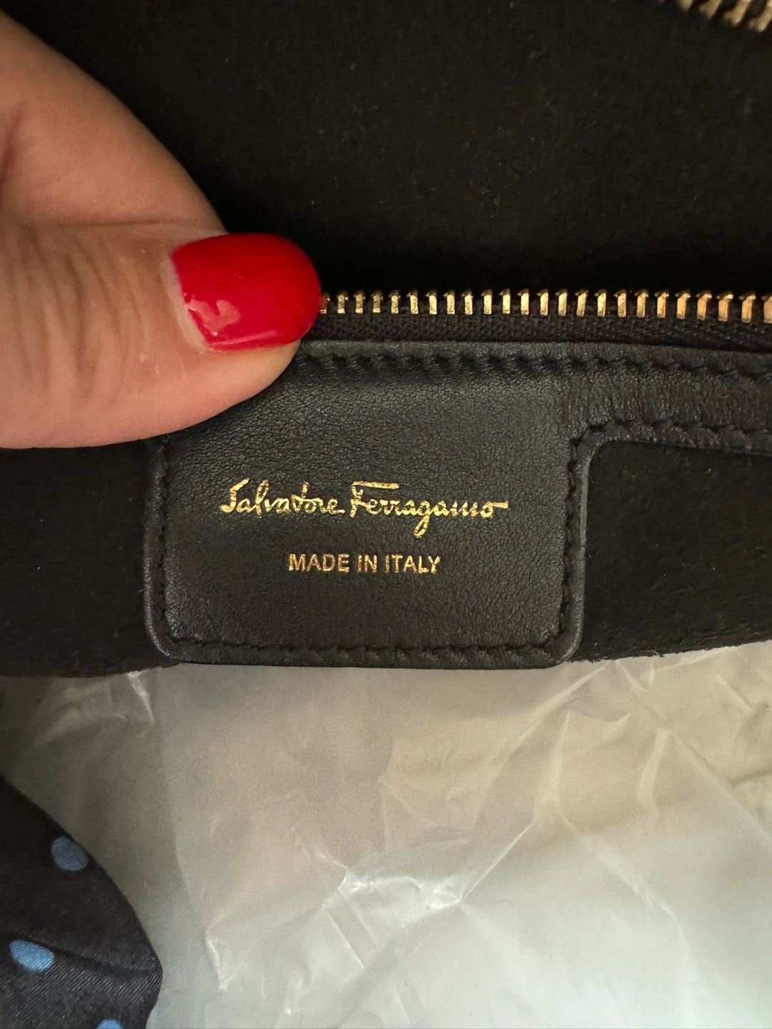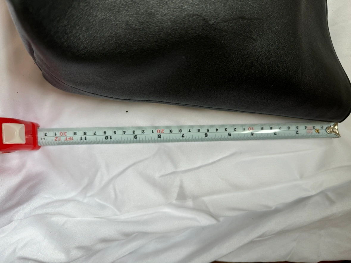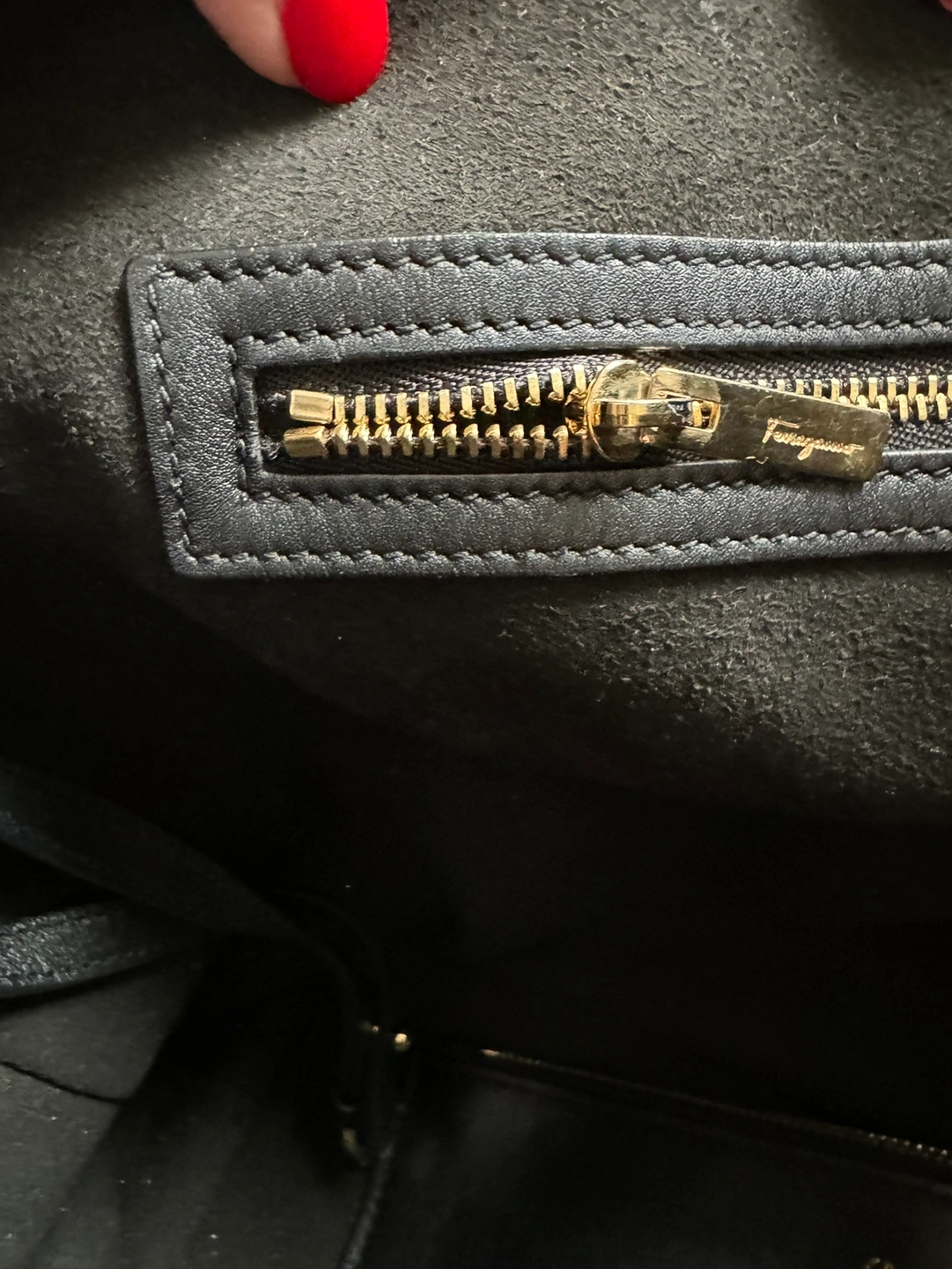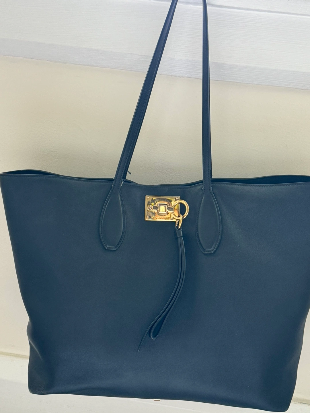 Large black leather tote bag with gold hardware and a tassel. The bag has a roomy interior and is perfect for everyday use. And a small bag inside.