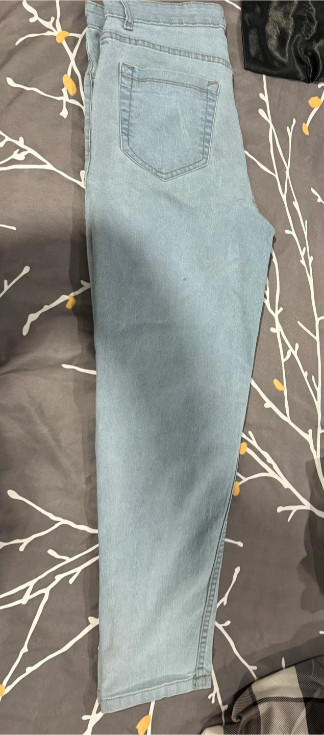These light wash denim jeans are a classic staple. They feature a button and zipper closure. Made from durable denim material.