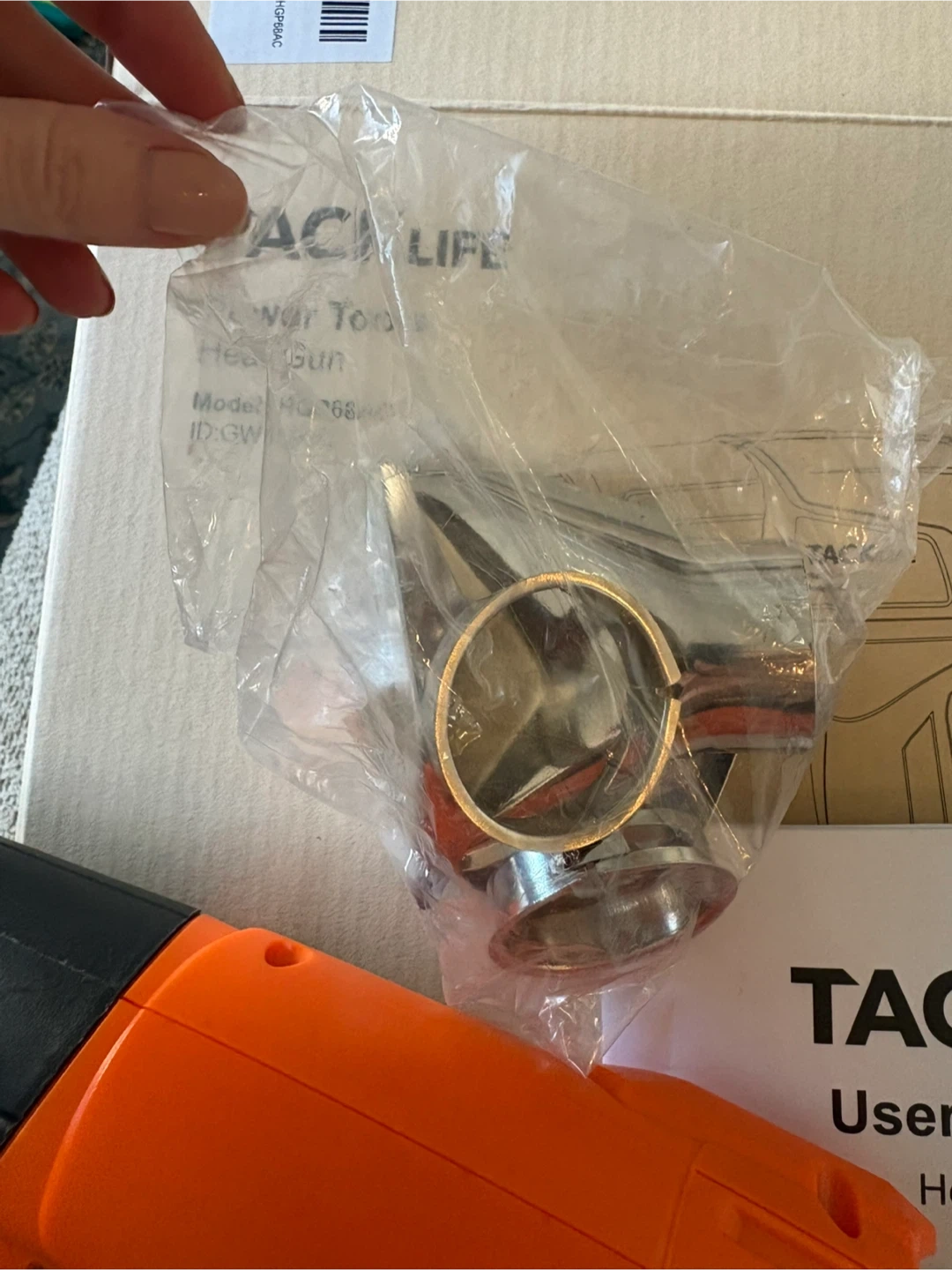 This is a TACKLIFE heat gun, model HGP68AC. It's orange and black and comes with an assortment of accessories. The power is 1500W with a voltage of 120V-60Hz. Includes the user manual and original box. This tool is handy for stripping paint or thawing pipes.
