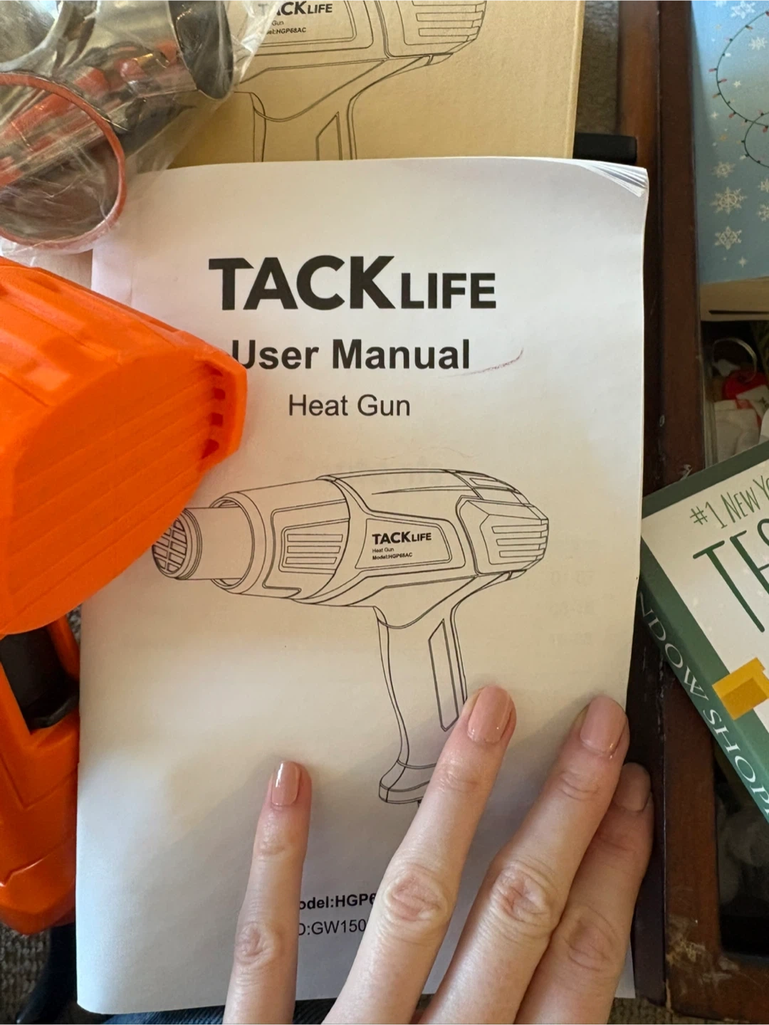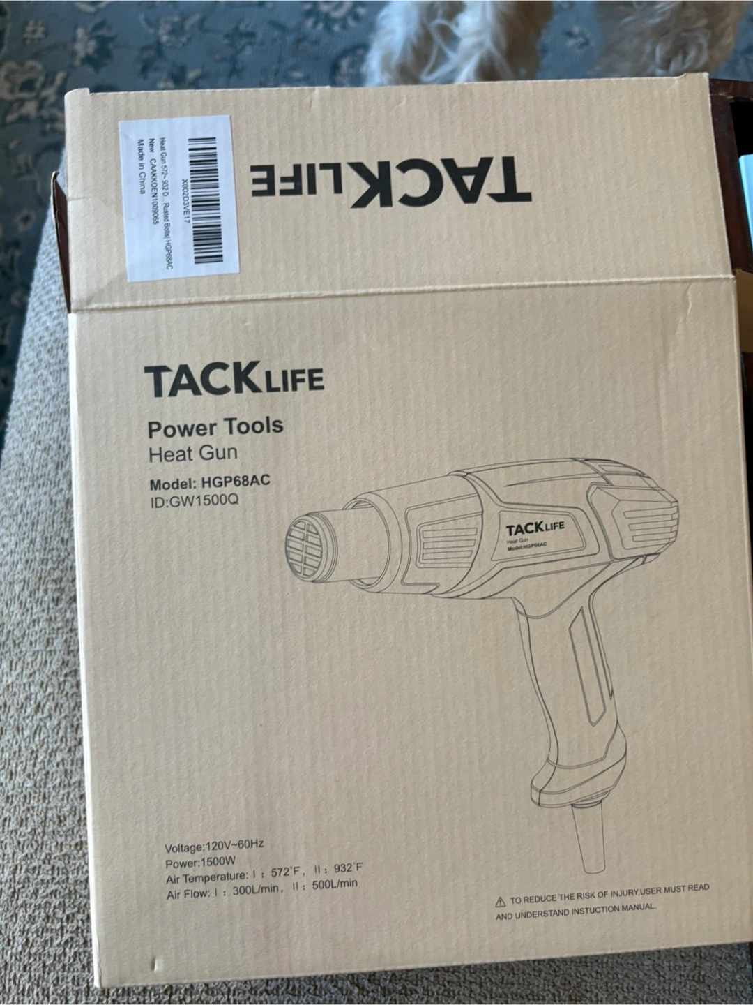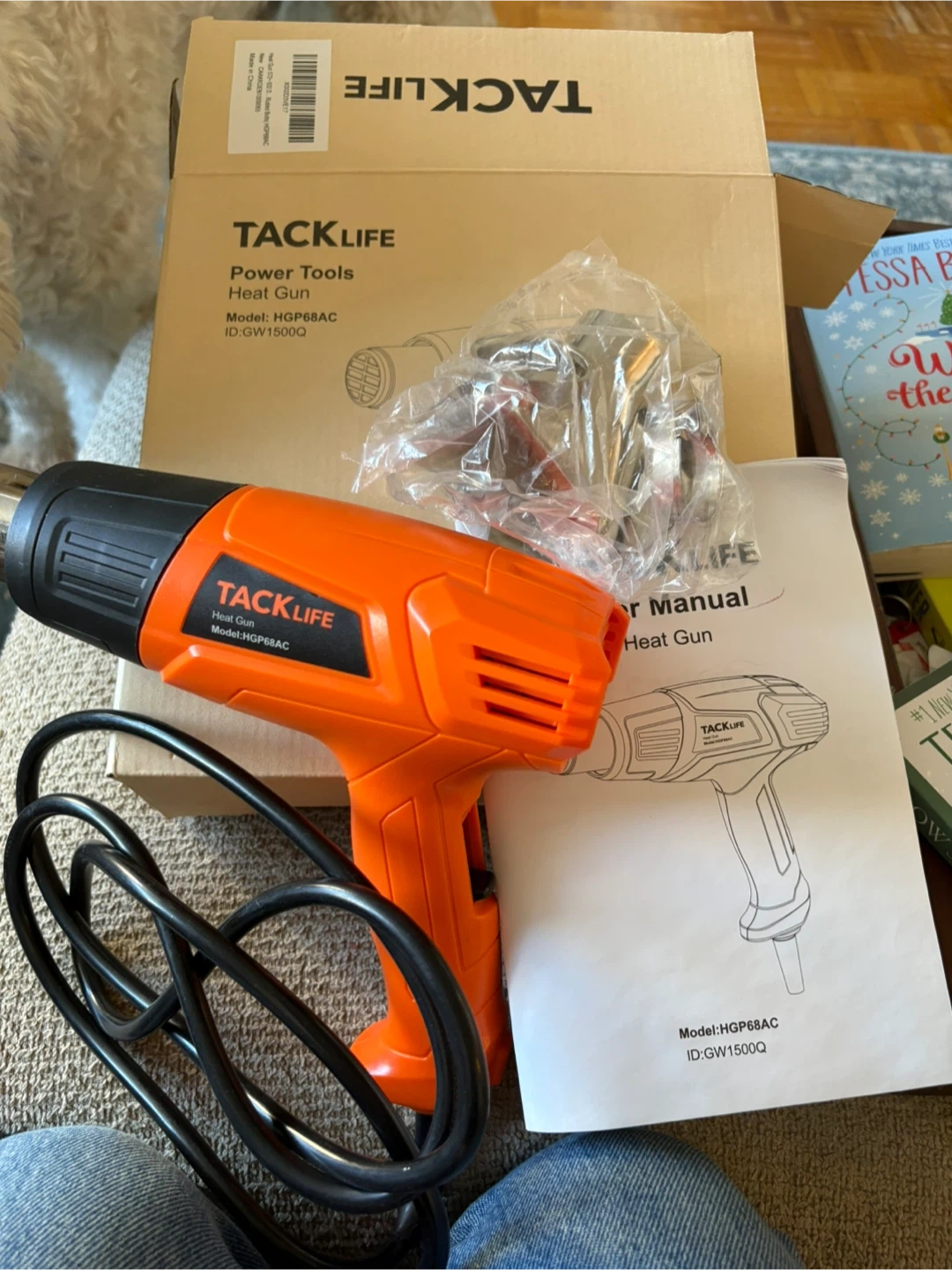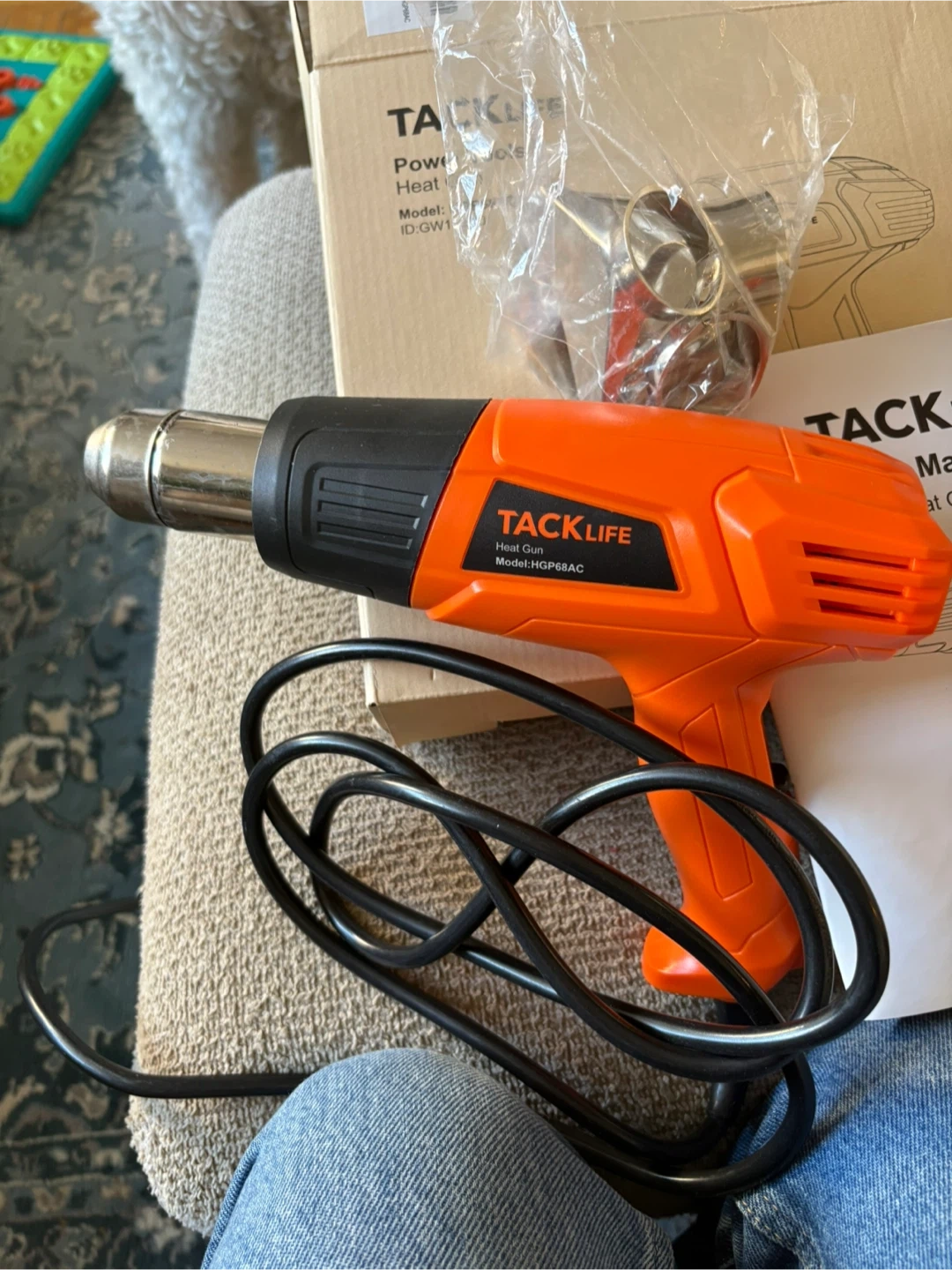 This is a TACKLIFE heat gun, model HGP68AC. It's orange and black and comes with an assortment of accessories. The power is 1500W with a voltage of 120V-60Hz. Includes the user manual and original box. This tool is handy for stripping paint or thawing pipes.