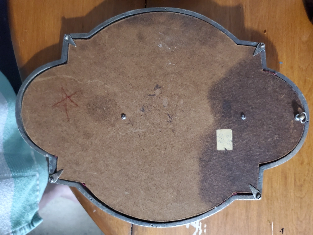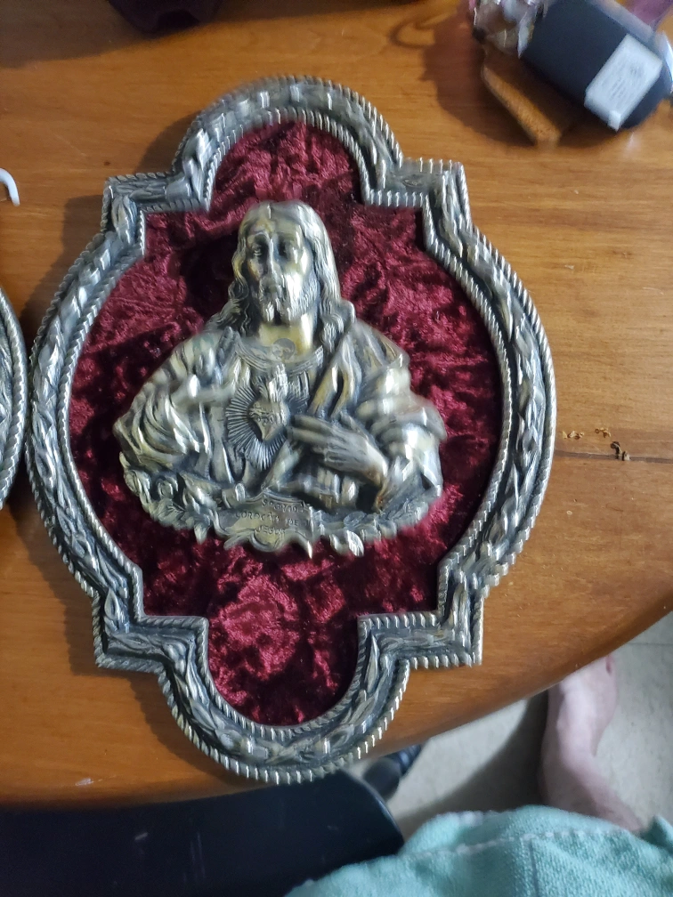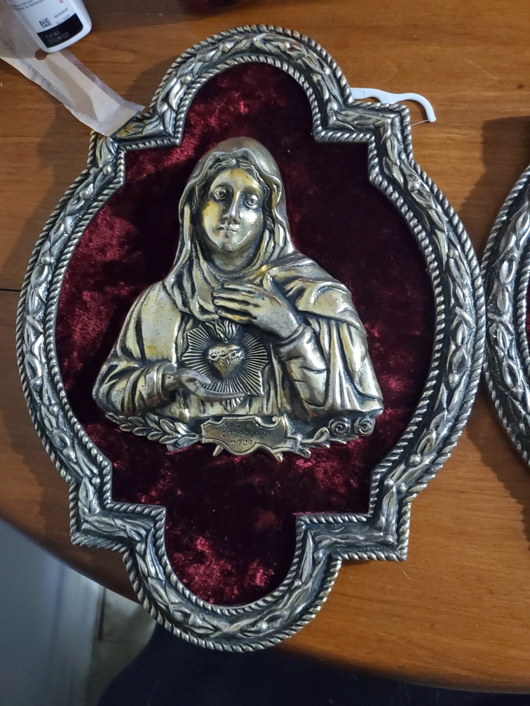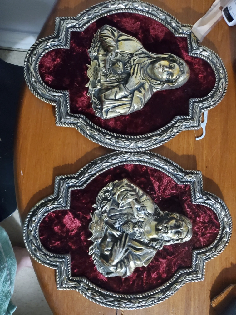 Selling a set of vintage wall art pieces featuring the Sacred Heart of Jesus and Mary. These have a unique, antique look with a metal frame and red velvet backing, perfect for adding a touch of vintage charm to your home decor