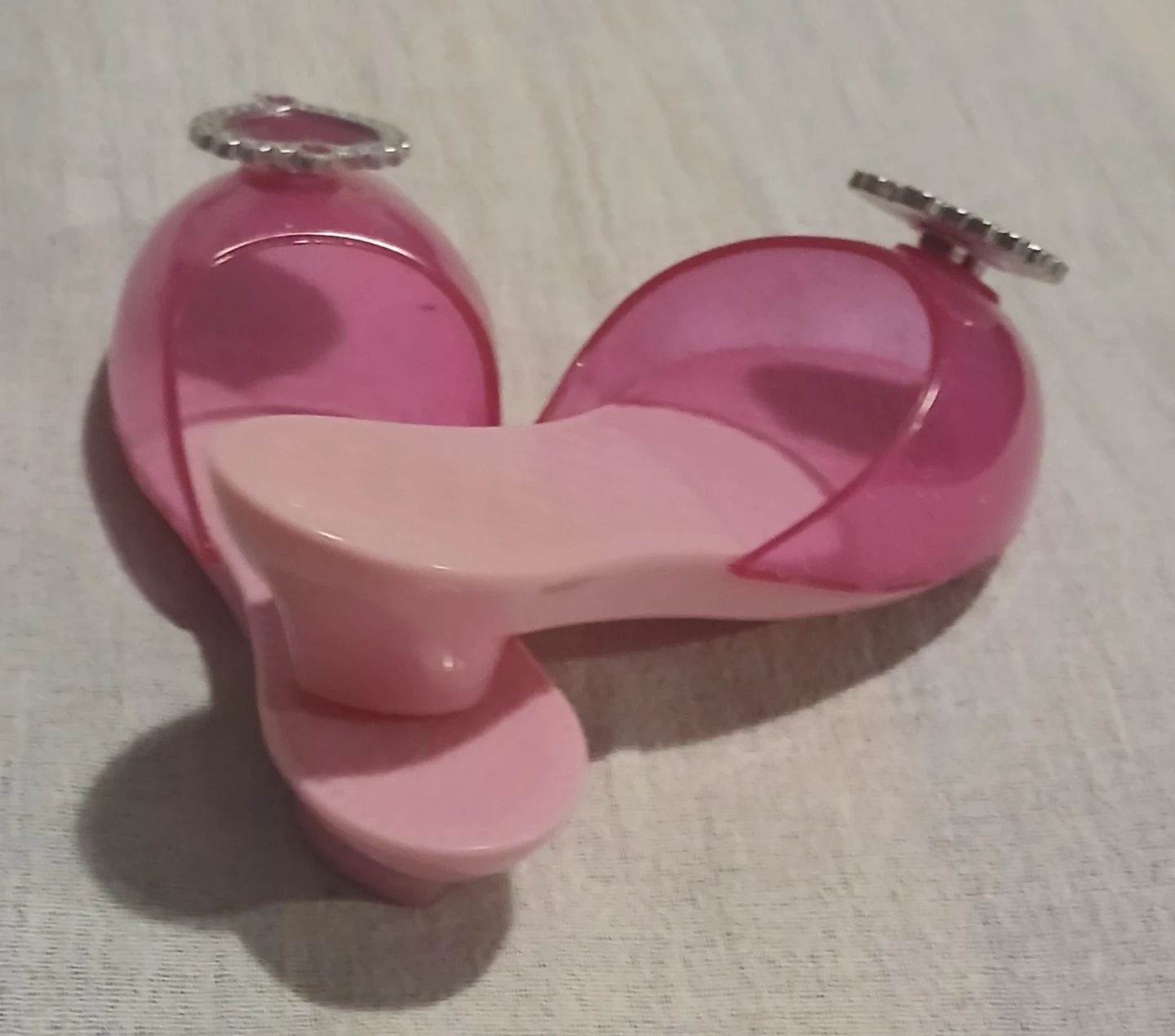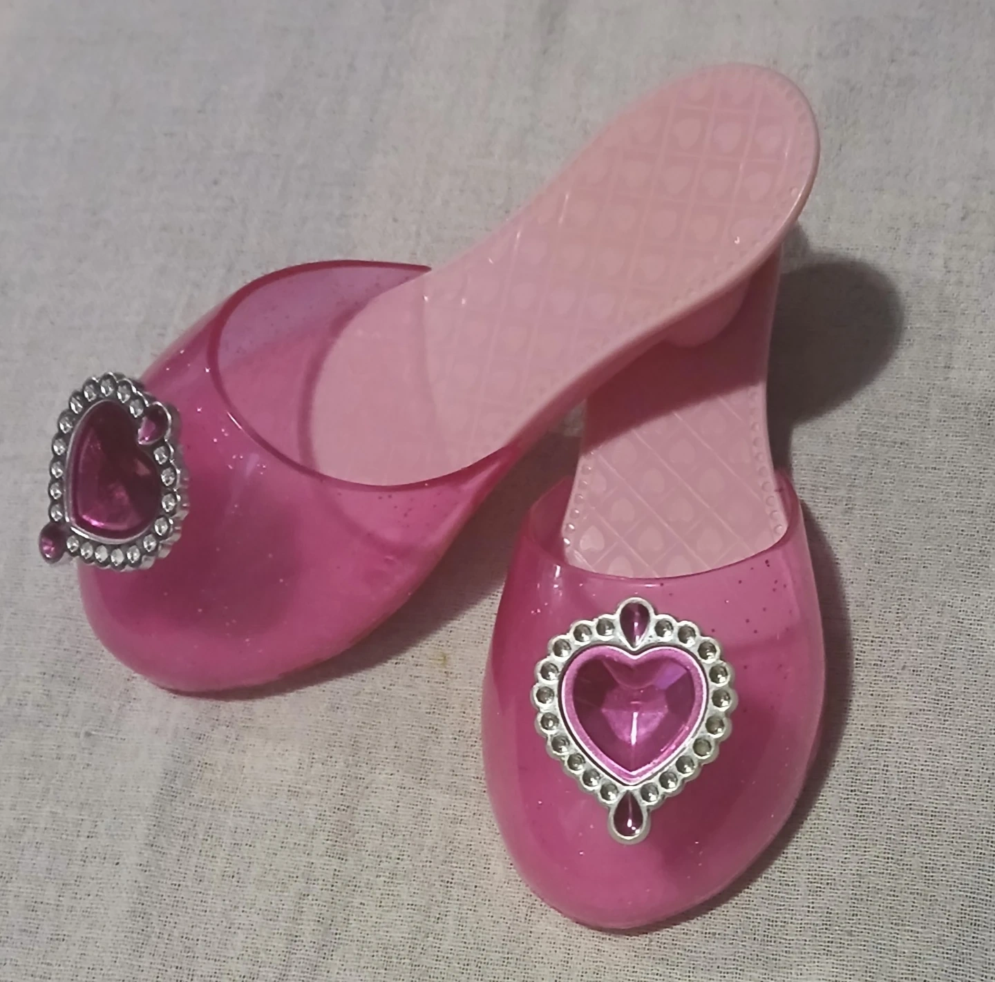 These are a pair of adorable pink toy princess heels! They're perfect for dress-up and imaginative play. The heels feature cute heart-shaped decorations. They are in good condition and ready for a new little princess!