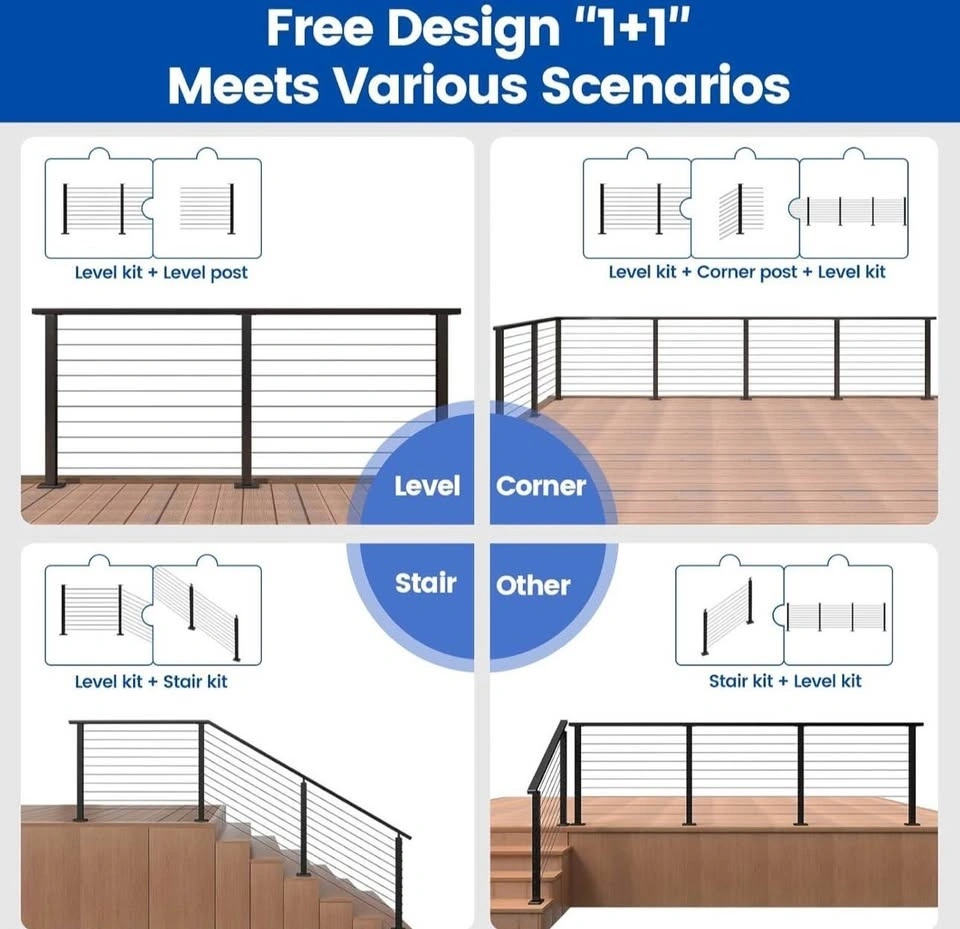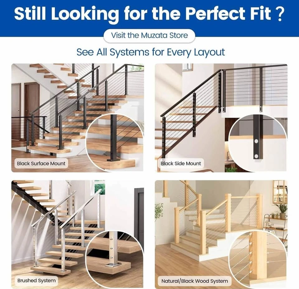 Brand new Muzata cable railing system DIY kit. Includes two 36" black posts (PS02) suitable for 5–10 ft spans and 150 ft of 1/8" stainless steel wire rope (WR19). Perfect for deck, balcony, or stair railing projects with a clean, modern look.