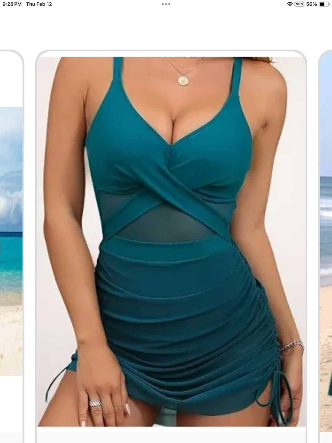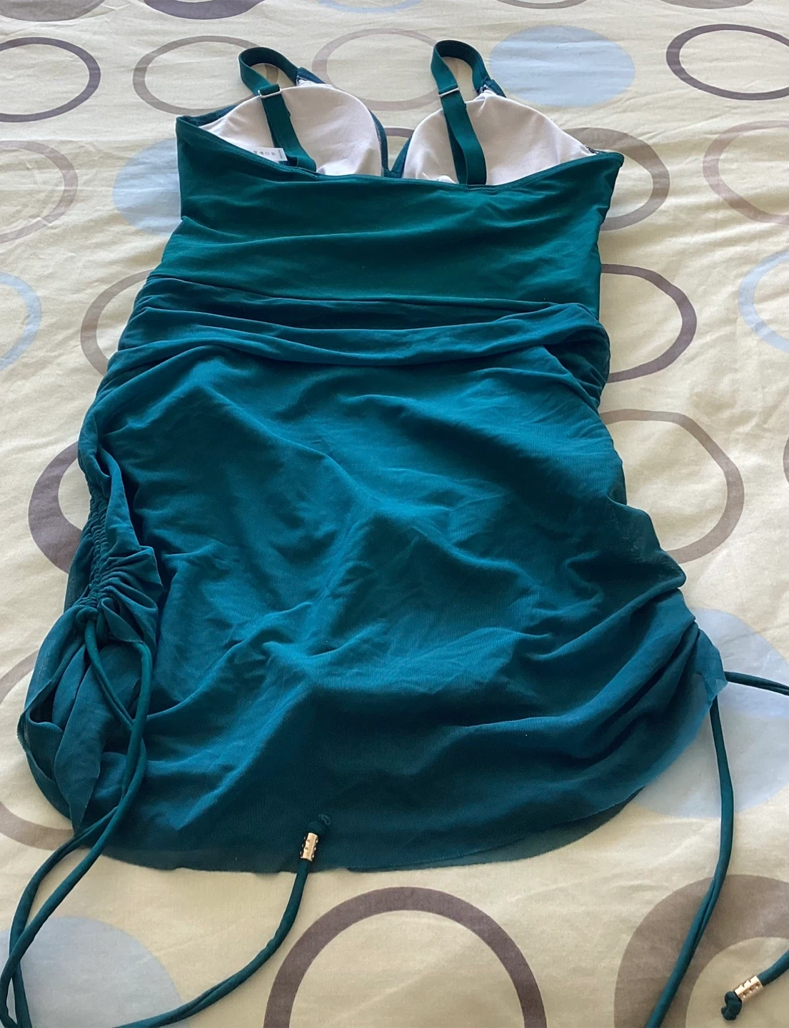 This one-piece swimsuit features a V-neck and adjustable drawstring for a custom fit. It has a built-in bottom and mesh sheer overlay. I have one in teal and one in black both size medium.