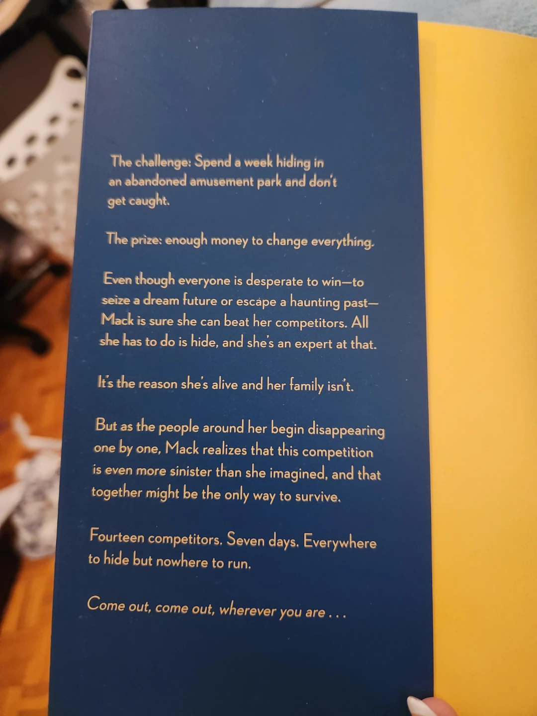 This graphic novel adaptation of 'Hide' by Kiersten White is presented. It's about fourteen competitors hiding for seven days in an abandoned amusement park. The prize is enough money to change everything. Contains swearing. If you interested chat with me and I'll give you the meeting spot/my address.