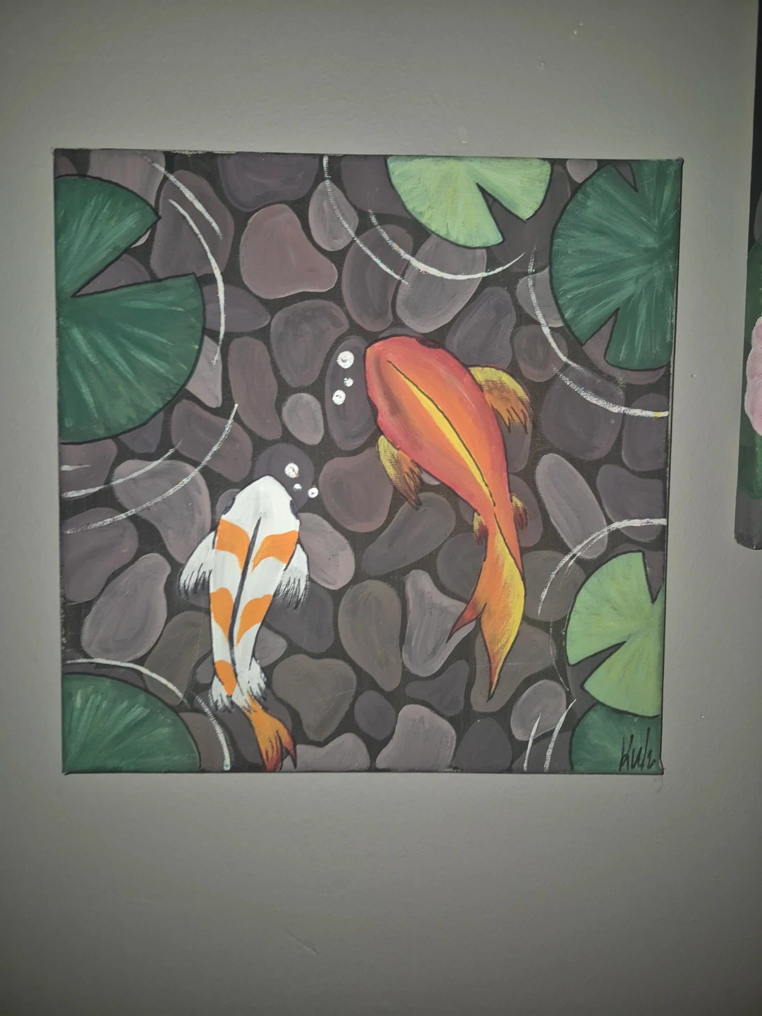 A lovely hand-painted canvas featuring two koi fish swimming amongst lily pads and stones. It's a vibrant acrylic painting that would brighten up any room. The artist's signature is visible in the bottom right corner. This piece adds a touch of tranquility and nature to your decor.