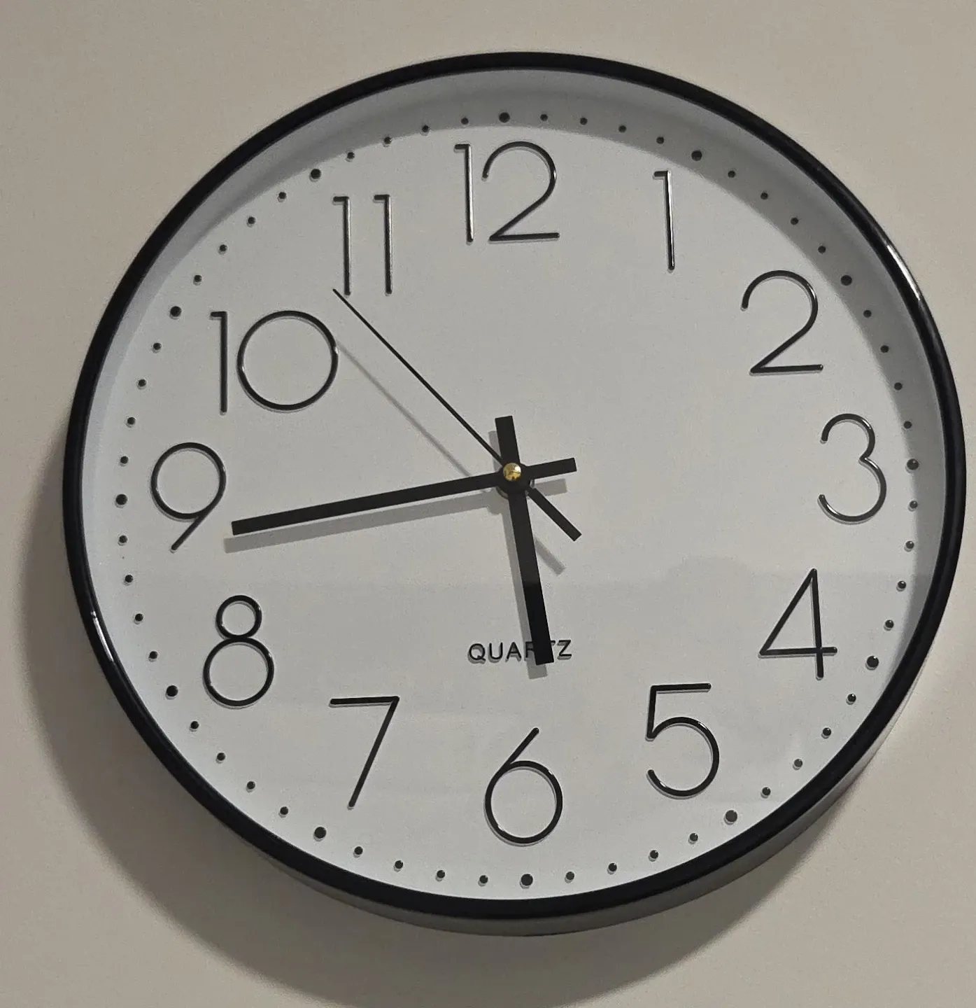 This is a white quartz wall clock. It has a black frame and easy-to-read numbers. Quartz movement for accurate timekeeping.