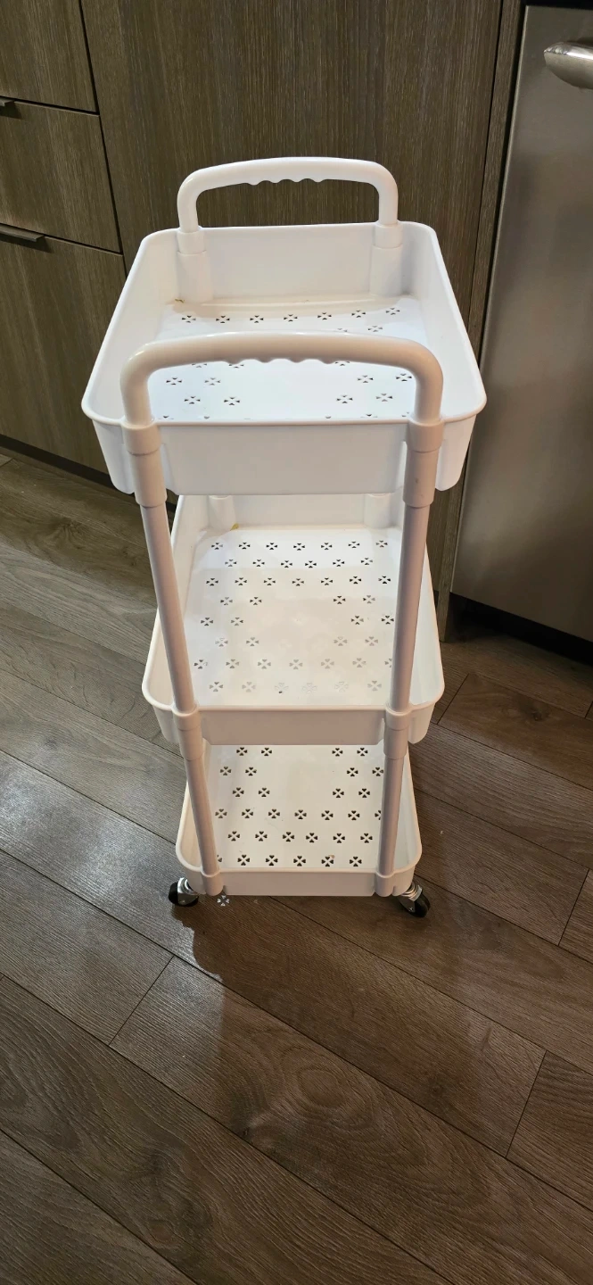 This is a 3-tier rolling storage cart in white. It measures 76cm tall, 39cm wide, and 29cm deep. The cart has wheels for easy mobility. It's great for organizing various items around the home.