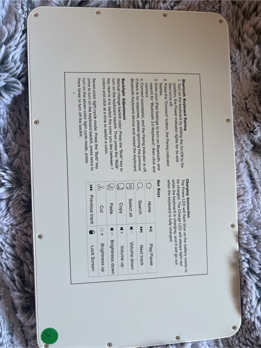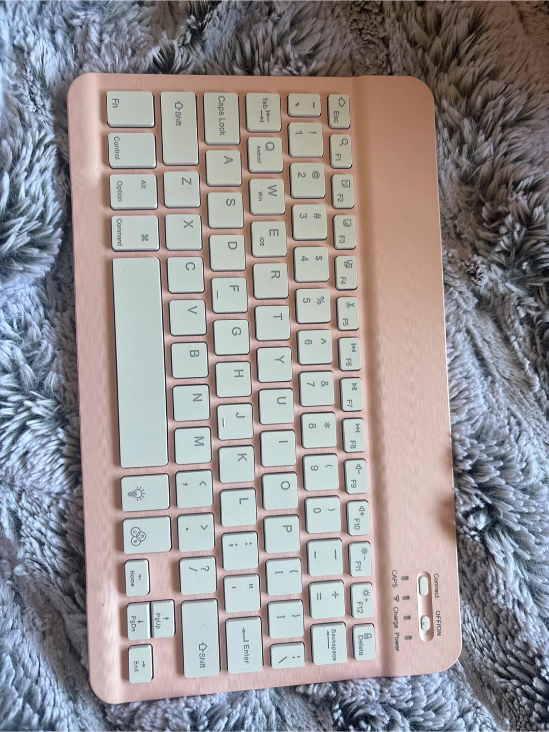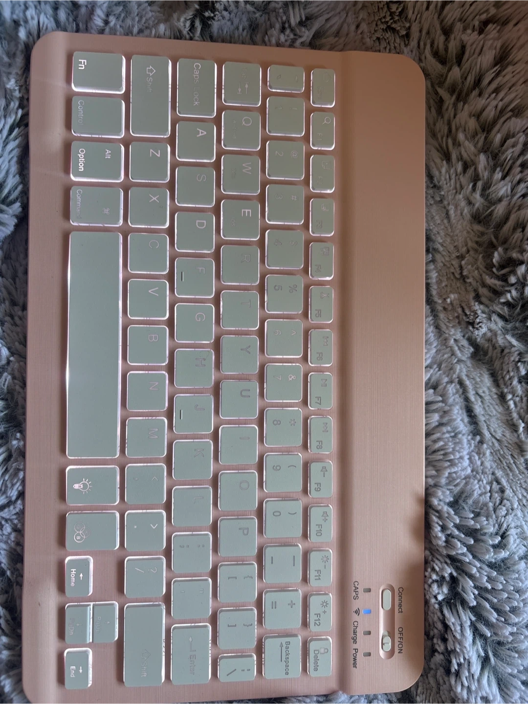 This is a rose gold Bluetooth keyboard with a backlight. It offers seven-colour light cycle mode and adjustable brightness. Connects via Bluetooth 3.0.
