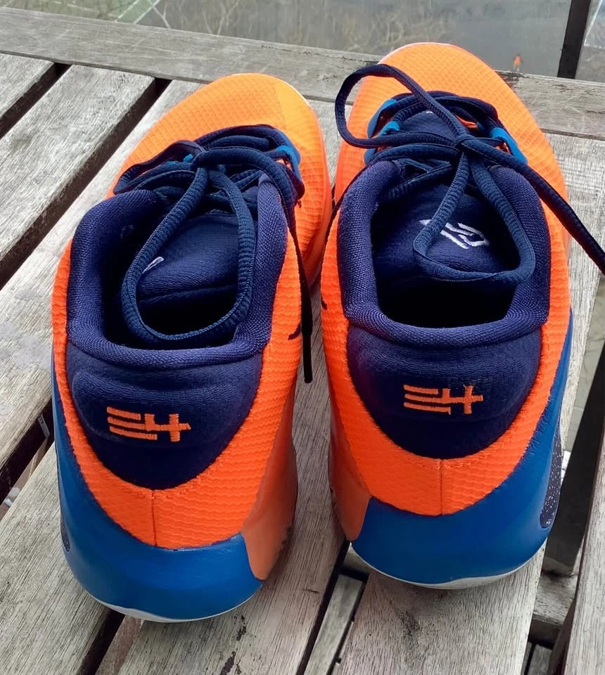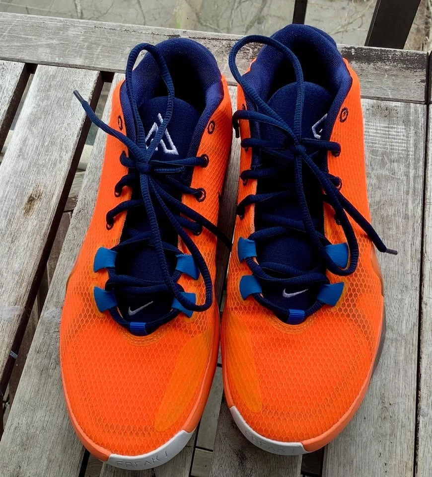 Nike Zoom Freak 1 All Bro Orange Blue Basketball Shoes in size 9 (Euro 42.5). These are a stylish and functional pair of athletic sneakers designed for men. They feature a lace-up closure and low-top shoe shaft style, offering comfort and support. The orange and blue color scheme adds a bold touch. The design is breathable and cushioned for comfort. Near mint condition as my son wore them only once because he decided there was too much orange.