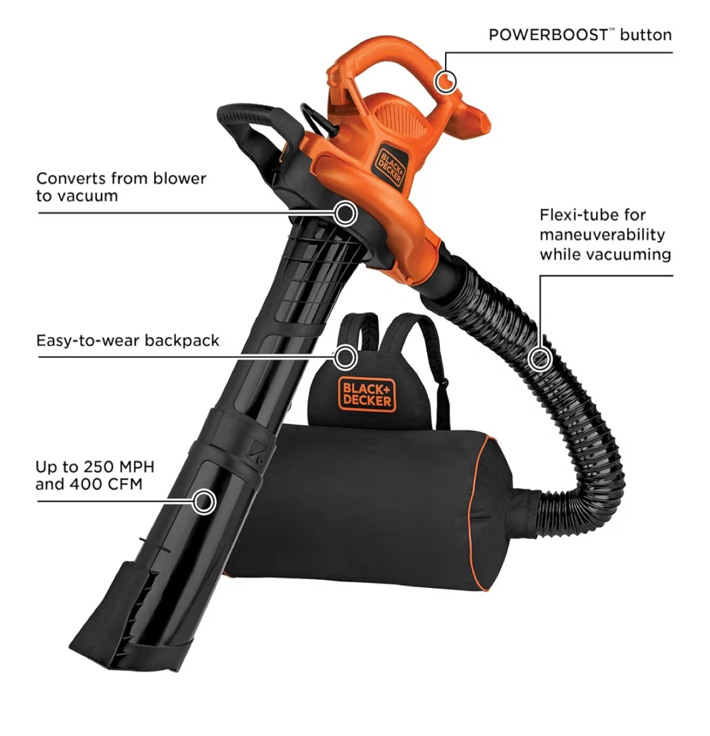 This is a BLACK+DECKER leaf blower that converts to a vacuum. It includes an easy-to-wear backpack for collecting debris. It offers up to 250 MPH and 400 CFM airflow.