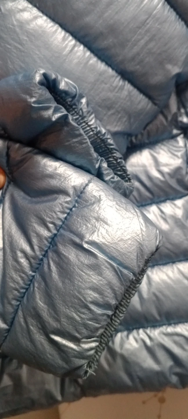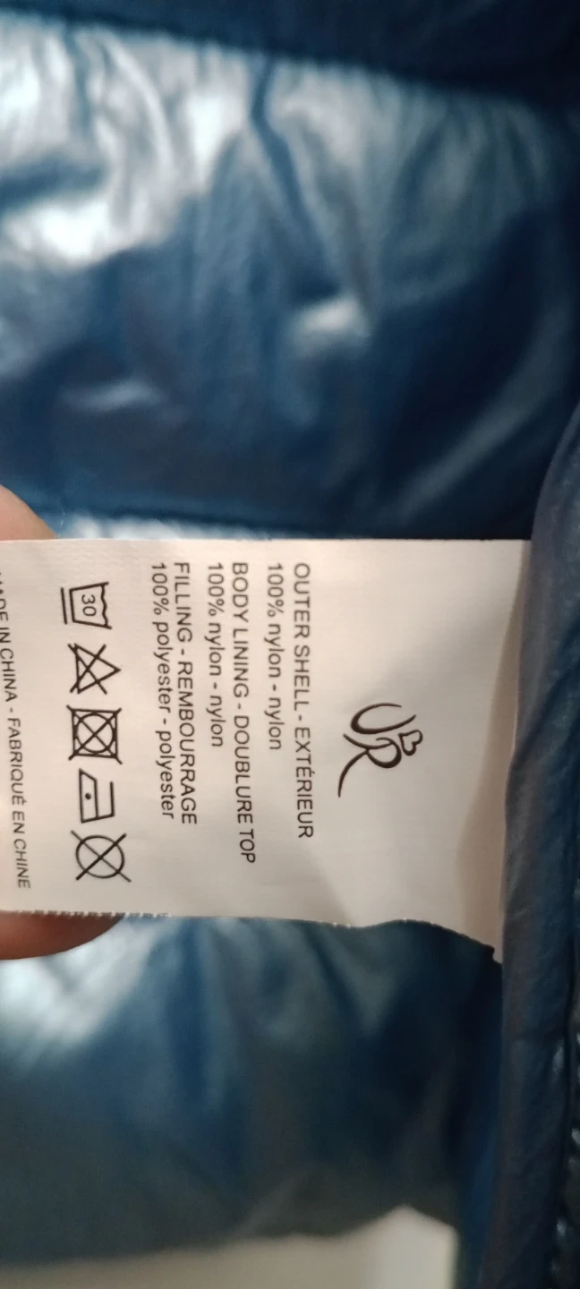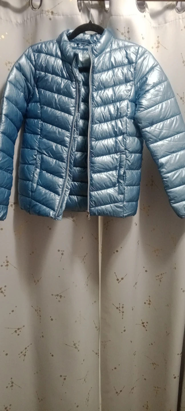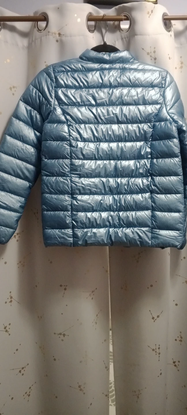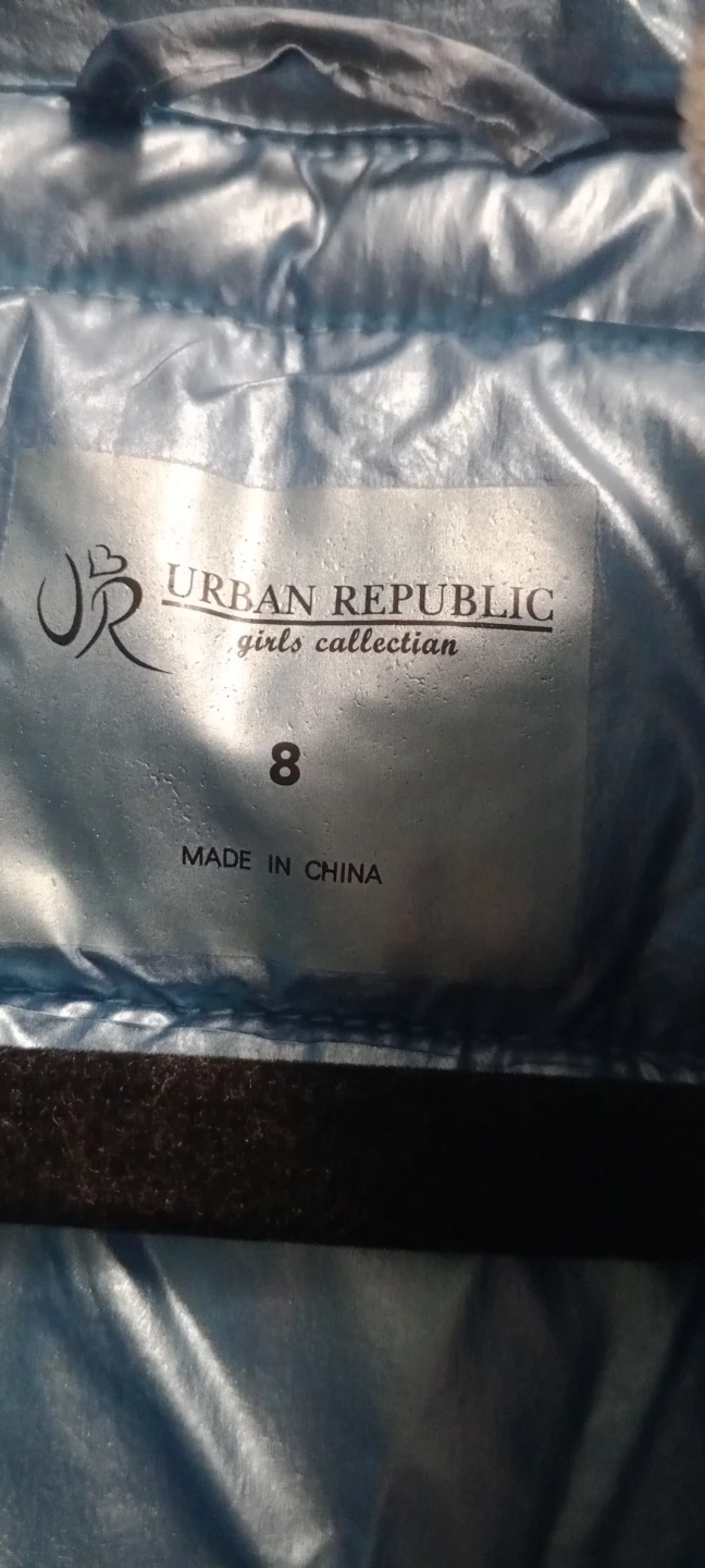 This light blue puffer jacket is from Urban Republic's girls collection. It's made with a 100% nylon outer shell and lining, and filled with 100% polyester. The jacket has elastic cuffs.