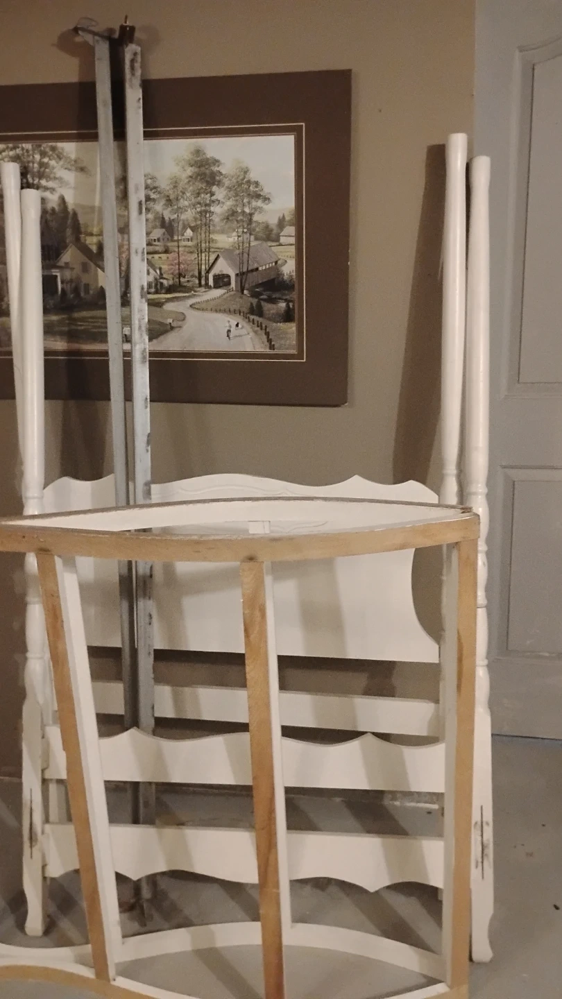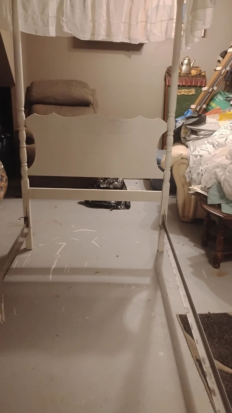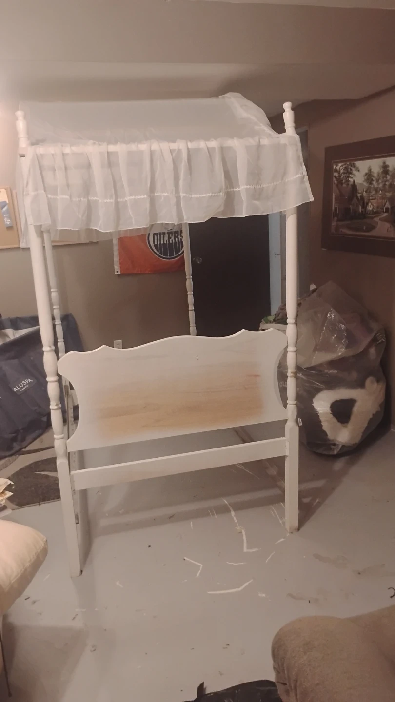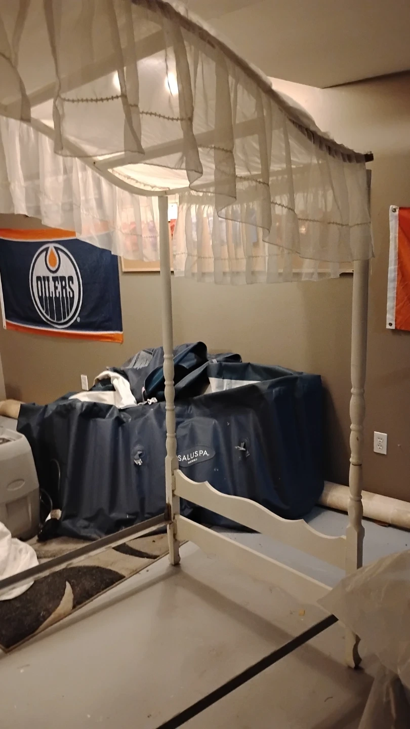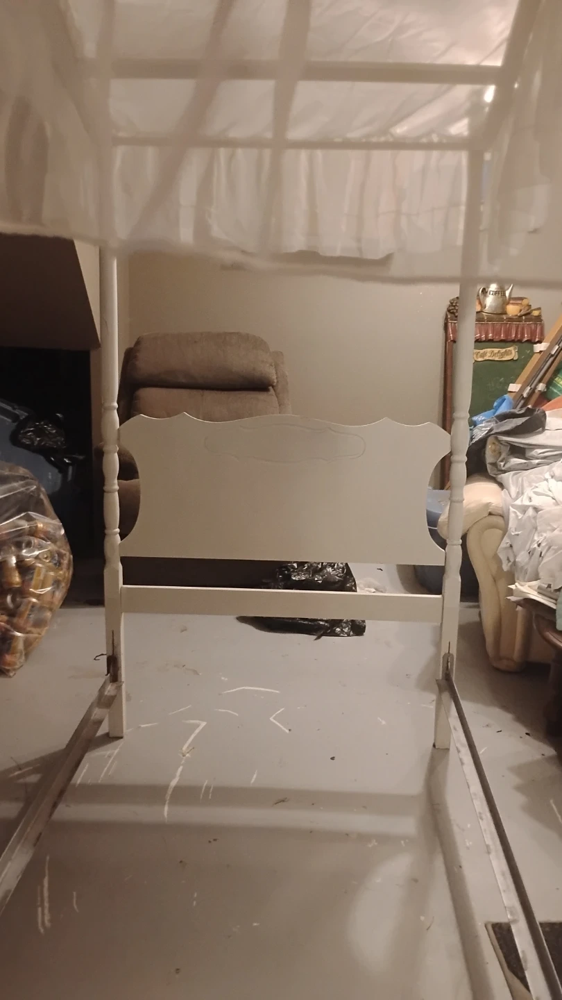 Selling a white canopy single bed frame. ready to be set up in your home canopy top, perfect for creating a cozy and stylish bedroom space.its older antique. Not perfect but with some paint she would be nice .missing 2 finials. Sturdy frame . Comes with original canopy and comforter . $30 reflects condition . In dover