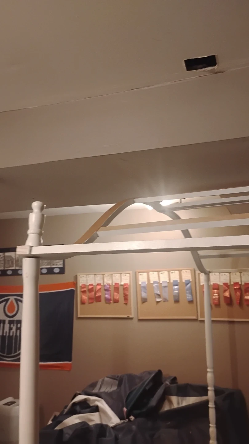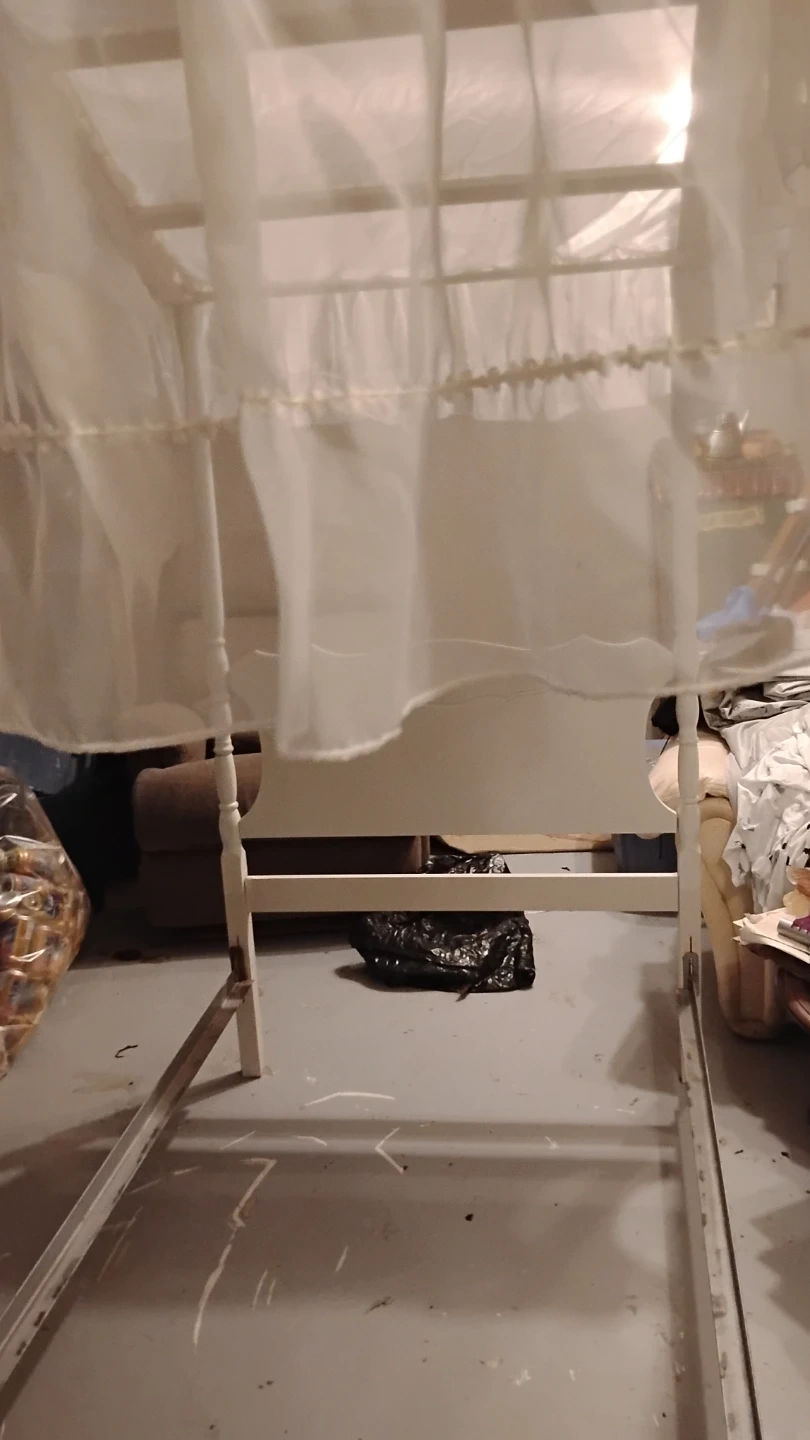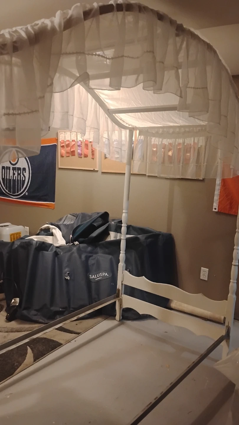 Selling a white canopy single bed frame. ready to be set up in your home canopy top, perfect for creating a cozy and stylish bedroom space.its older antique. Not perfect but with some paint she would be nice .missing 2 finials. Sturdy frame . Comes with original canopy and comforter . $30 reflects condition . In dover