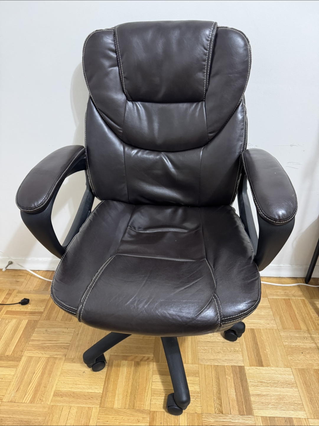 Comfortable brown leather office chair. Features armrests and rolling casters. Suitable for home or office use.