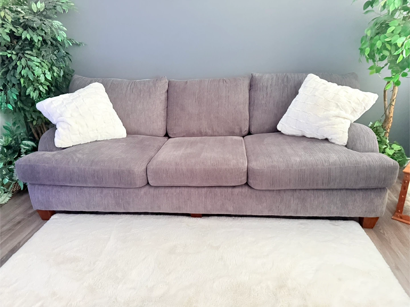 Comfortable three-seater sofa with plush cushions. Upholstered in a soft grey corduroy fabric. It's perfect for any living room space.