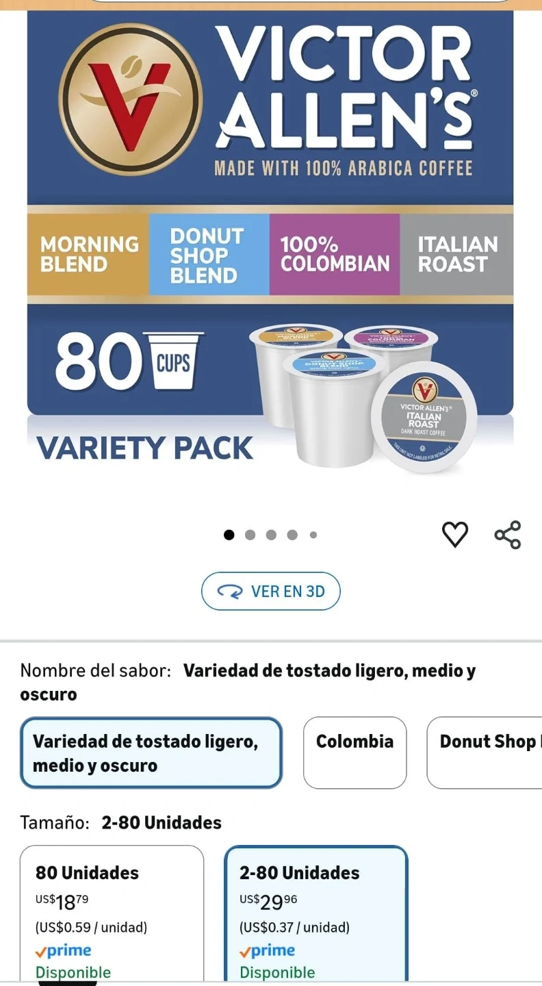 This is a variety pack of Victor Allen's coffee. It includes 80 single-serve cups. The blends included are Morning Blend, Donut Shop Blend, 100% Colombian, and Italian Roast.