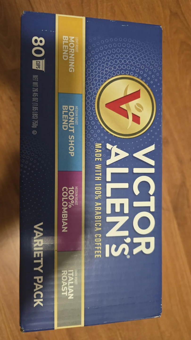 This is a variety pack of Victor Allen's coffee. It includes 80 single-serve cups. The blends included are Morning Blend, Donut Shop Blend, 100% Colombian, and Italian Roast.