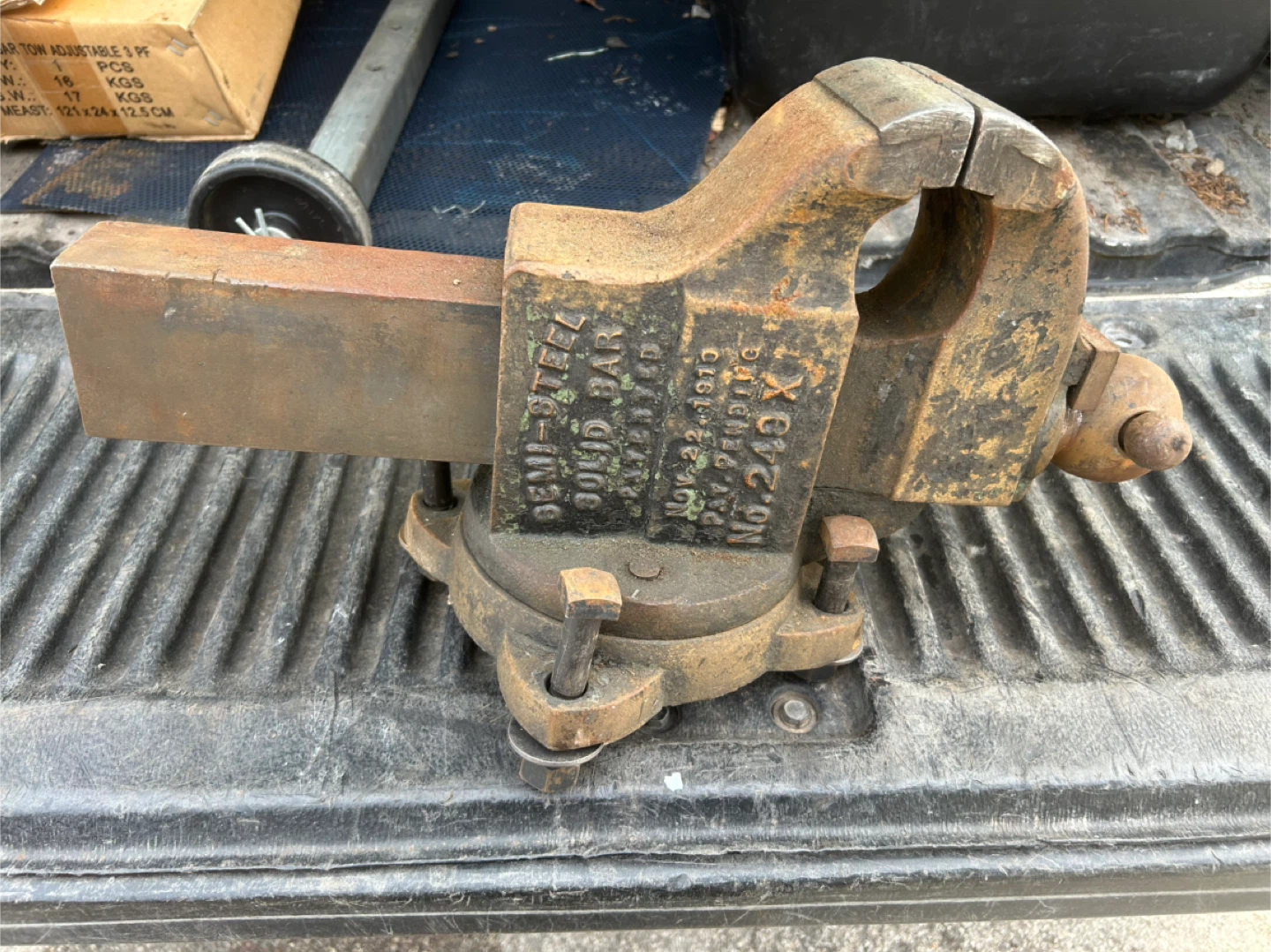 This is a Chas. Parker Co. Semi-Steel Solid Bar vise. It's a solid, heavy-duty tool that's been manufactured for a long time. This vise is useful for any workshop or garage.